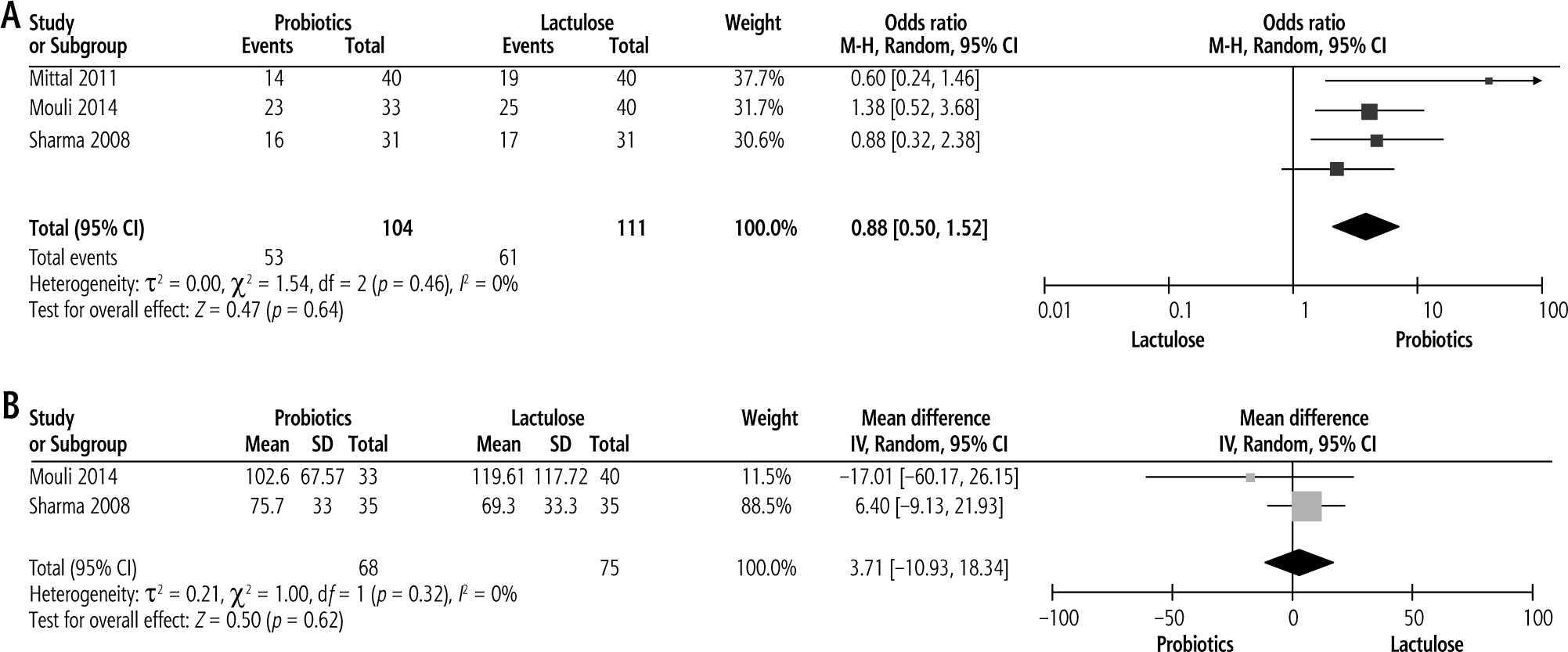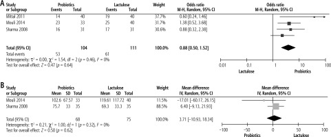 Three studies compared the efficacy of probiotics with lactulose on reversal of MHE with pooled analysis showing lactulose to be more effective but not significant compared to probiotics with pooled OR of 0.88 (p = 0.64, 95% CI: 0.50 to 1.52) (Fig. 3A).