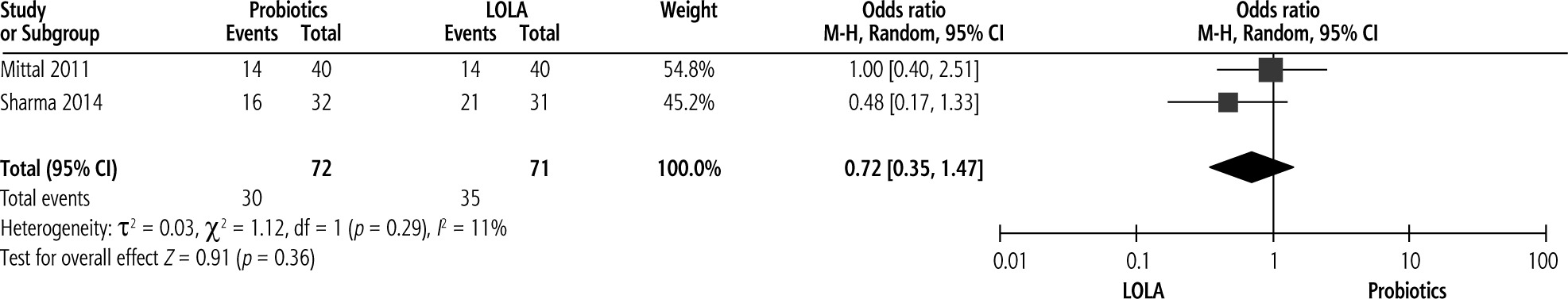 Two studies compared efficacy of probiotics with LOLA on reversal of MHE with pooled analysis revealing no significant improvement of MHE with probiotics compared to LOLA, with pooled OR of 0.72 (p = 0.36, 95% CI: 0.35 to 1.47) (Fig. 4).