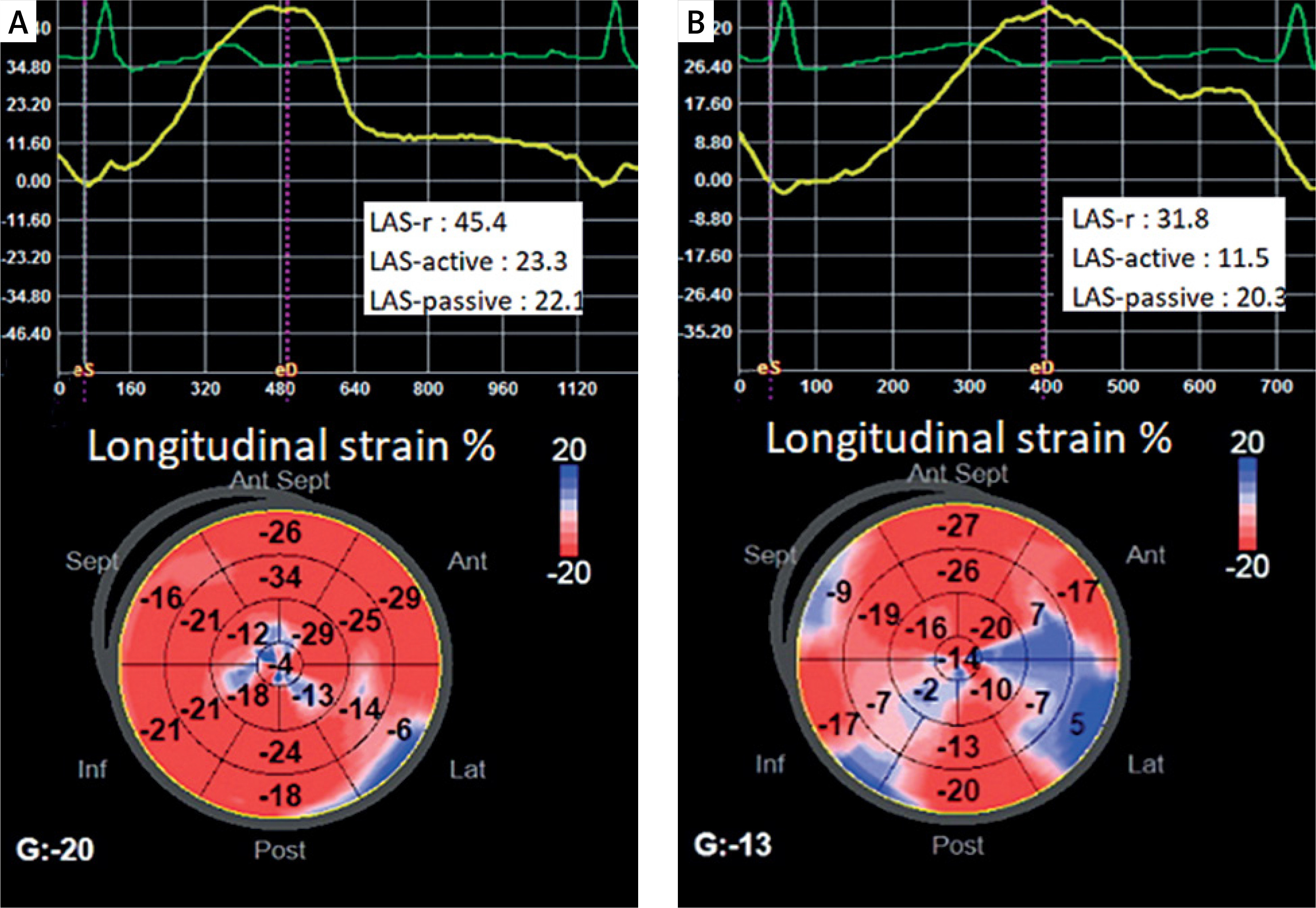 A – LAS and LV-GLS values of a healthy person from the control group, B – LAS and LV-GLS values of a patient from the PVC+ group