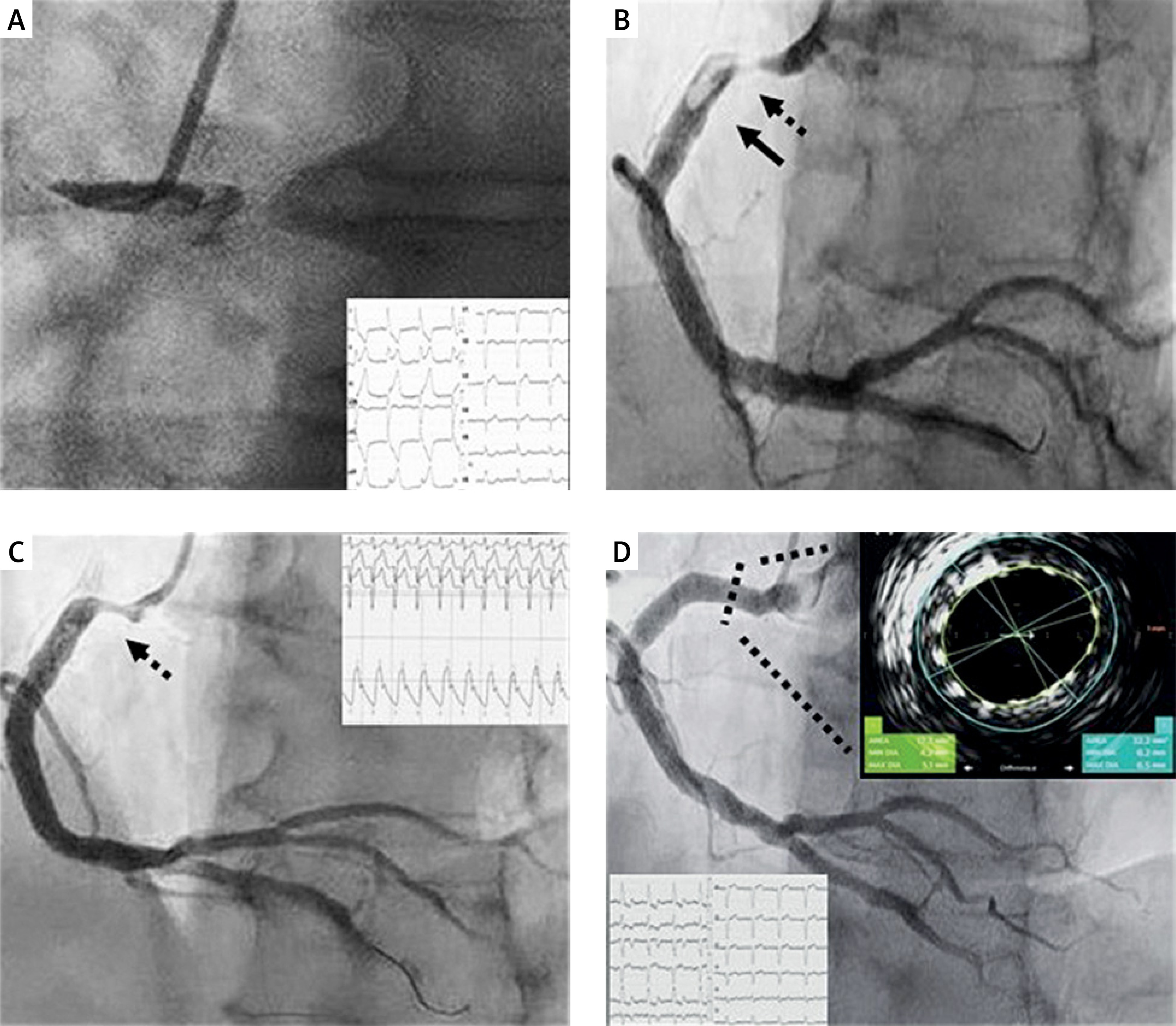 A – Baseline 12-lead electrocardiogram (ECG) showing inferior ST-elevation in leads II, III, aVF with the presence of left bundle branch block and an urgent coronary angiography an acute right coronary artery (RCA) occlusion with Thrombolysis in Myocardial Infarction (TIMI) grade 0 flow. B – Workhorse guidewire crossed the obstruction easily and positioned distally in the posterior descending artery (PDA). Severe stenosis (dotted line with arrow) with large thrombus burden (LTB) (black arrow) was revealed proximally in RCA. C – 30 min after intracoronary thrombolysis there was electrocardiographic (typical accelerated idioventricular rhythm, well tolerated) and angiographic evidence of successful reperfusion with TIMI 3 flow in PDA with complete thrombus resolution, and evidence of severe proximal RCA stenosis (dotted line with arrow). D – An excellent angiographical result was obtained following implantation of a Resolute Onyx 5.0 × 18 mm drug-eluting stent post-dilated with a non-compliant 6.0 × 8 mm balloon, based on cross-sectional intravascular ultrasound imaging with the Eagle Eye Platinum ST catheter (Volcano). Post-PCI 12-lead ECG showing inferior non-Q myocardial infarction evolution