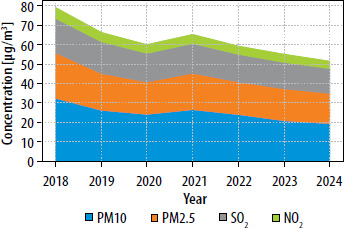 Average annual concentrations of PM10 and PM2.5 particulate matter, nitrogen dioxide, and sulphur dioxide in Poland from 2018 to 2024. Source: authors’ own study based on data from the Chief Inspectorate of Environmental Protection (GIOŚ)