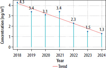 Also, in the analysed period from 2018 to 2024, there was a decrease in selected average annual concentrations of benzo(a)pyrene in Poland (except for 2021, where they increased compared to 2020), reaching 4.3 ng/m3 in 2018 and 1.3 ng/m3 in 2024, respectively (Figure 2).