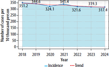 Morbidity among children and adolescents aged 0 to 18 years in Poland in 2018–2024 (incidence rate /10,000). Source: authors’ own study based on data from the Ministry of Health – Department of Public Health and the Department of Analysis