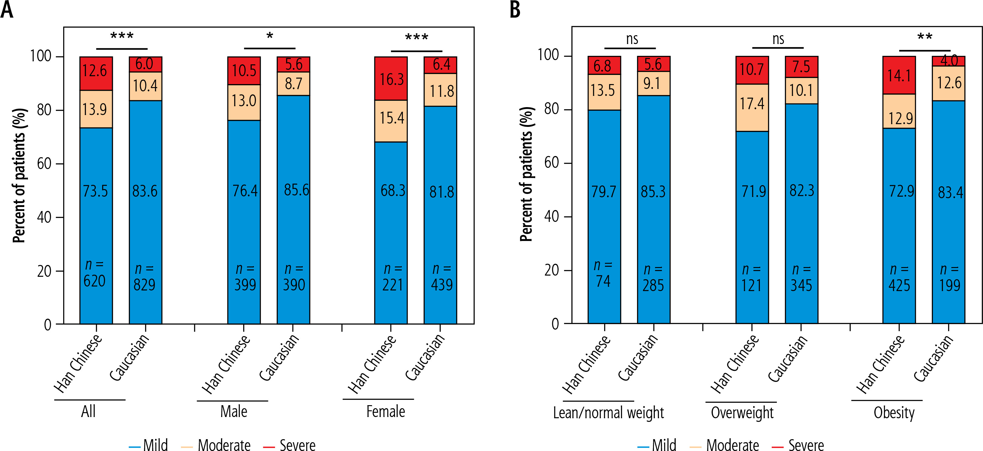 Distribution of steatosis severity in Han Chinese and Caucasian MASLD patients. A) All patients and gender subgroups; B) Different grades of body mass index (BMI) subgroups. Liver fat content (LFC) defined by magnetic resonance imaging proton density fat fraction (MRI-PDFF): 5% ≤ PDFF < 16.3% as mild fatty liver; 16.3% ≤ PDFF ≤ 21.7% as moderate fatty liver; PDFF > 21.7% as severe fatty liver; Body mass index (BMI, kg/m2) was calculated as body weight (kg) divided by the square of the standing height (m2), and it was categorized as lean/normal weight (< 23 kg/m2 for Chinese individuals or < 25 kg/m2 for Caucasian individuals), overweight (23-25 kg/m2 for Chinese individuals or 25-30 kg/m2 for Caucasian individuals), and obese (BMI > 25 kg/m2 for Chinese individuals or > 30 kg/m2 for Caucasian individuals); *p < 0.05, **p < 0.001, ***p < 0.0001; ns – not significant