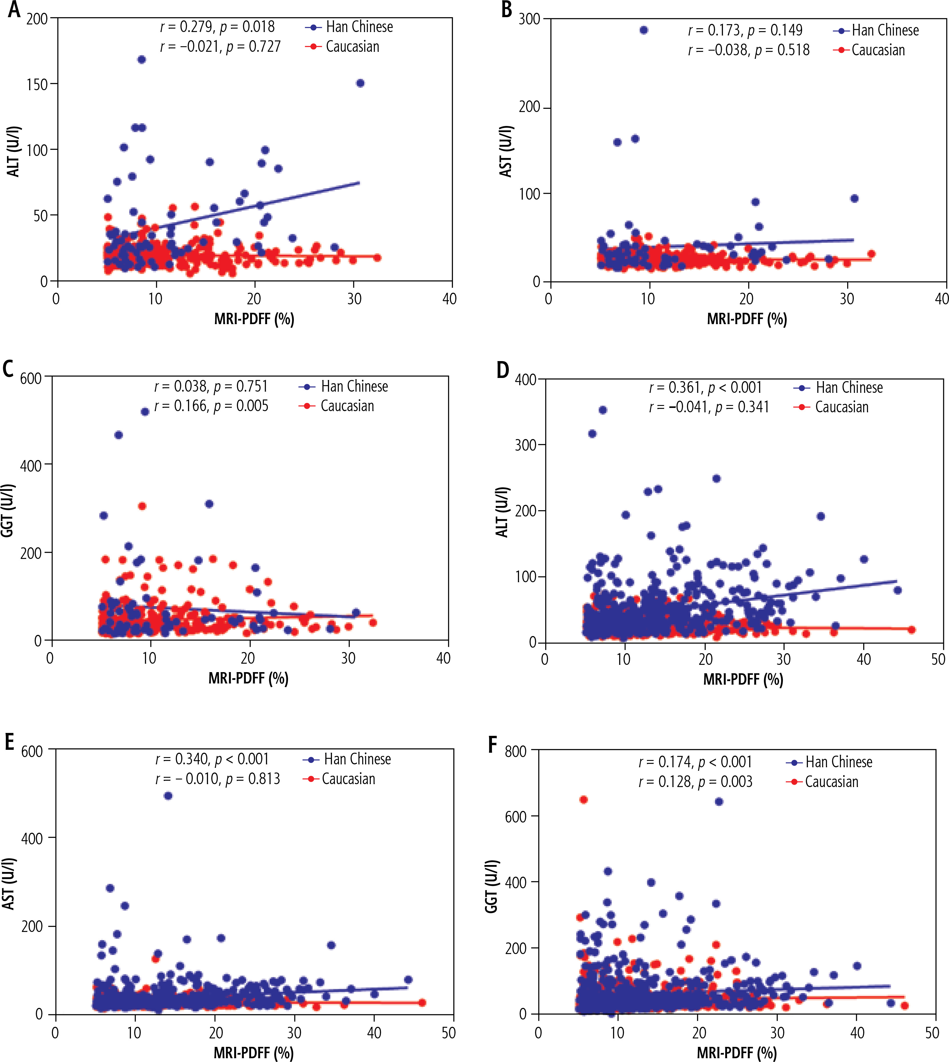 Relationships of liver transpeptidase with liver fat content (LFC) in Han Chinese and Caucasian MASLD patient subgroups with different BMI. A-C) Lean subgroup and D-F) Overweight-obesity subgroup. Liver enzymes include alanine aminotransferase (ALT), aspartate aminotransferase (AST) and γ-glutamyl transpeptidase (GGT); liver fat content (LFC) defined by magnetic resonance imaging proton density fat fraction (MRI-PDFF); body mass index (BMI, kg/m2) was calculated as body weight (kg) divided by the square of the standing height (m2), and it was categorized as lean/normal weight (< 23 kg/m2 for Chinese individuals or < 25 kg/m2 for Caucasian individuals), overweight (23-25 kg/m2 for Chinese individuals or 25-30 kg/m2 for Caucasian individuals), and obese (BMI > 25 kg/m2 for Chinese individuals or >30 kg/m2 for Caucasian individuals)