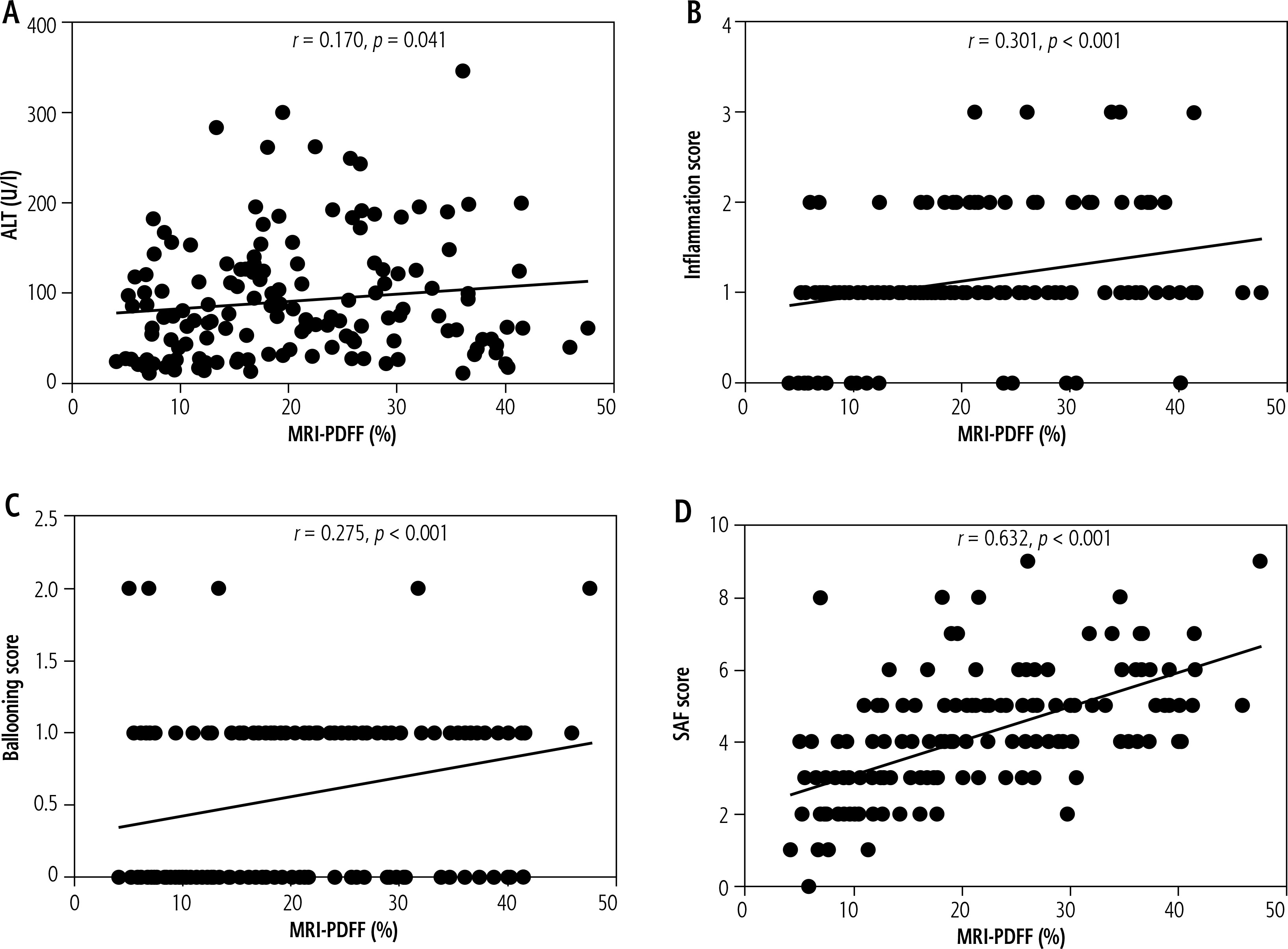 A total of 146 Han Chinese MASLD patients had received liver biopsy, which was performed within 2 weeks of MRI-PDFF and laboratory tests with assessment of measured serum ALT levels. Detailed baseline demographics and pathologic characteristics of these Han Chinese MASLD patients are presented in Suppl. Table 3. Spearman’s rank correlation analysis was conducted between serum ALT levels, inflammation scores, ballooning scores, and SAF scores of liver biopsies with average LFC, respectively. The levels of ALT showed a positive correlation with the average LFC (r = 0.170, p = 0.041; Fig. 3A), suggesting that Han Chinese MASLD patients with higher serum ALT levels tend to have severe liver steatosis. As expected, Han Chinese MASLD patients with greater liver histological severity also showed higher LFC, with significant correlations found for inflammation scores (r = 0.301, p < 0.001, Fig. 3B); ballooning scores (r = 0.275, p < 0.001; Fig. 3C); and SAF scores (r = 0.632, p < 0.001; Fig. 3D).