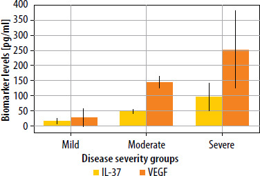 Statistical comparison of IL-37 and VEGF levels across disease severity groups. Statistically significant at p < 0.05