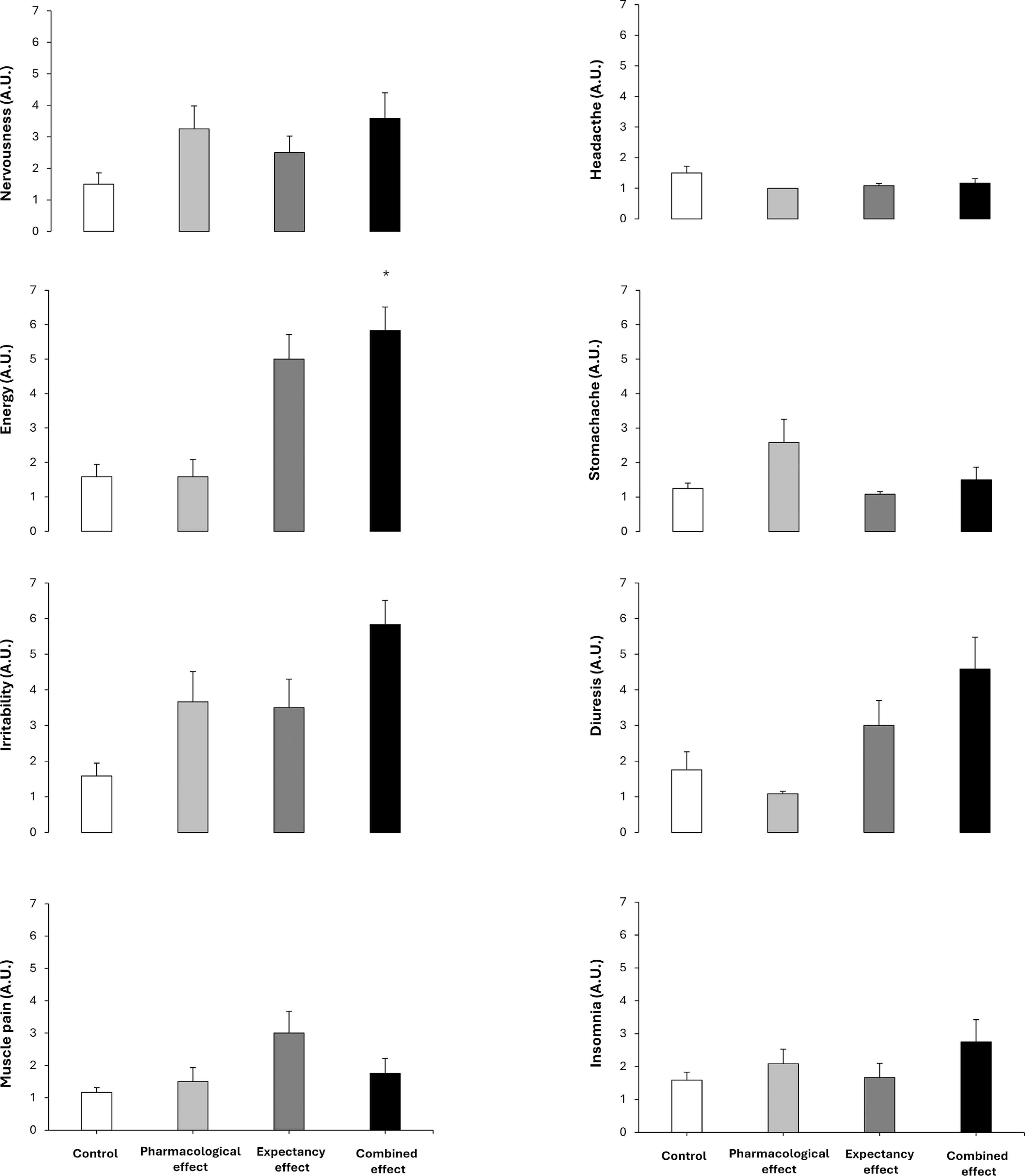 There were no main effects of substance received, substance informed or interaction between these effects for nervousness, irritability, muscle pain, headache, stomachache, diuresis, or insomnia (all p > 0.050; Figure 3). Only a main effect of substance informed was found for energy (p = 0.003). In the pairwise comparison, only the combined effect trial increased the energy over the control trial (p = 0.009; Wilcoxon r = 1.1 large).