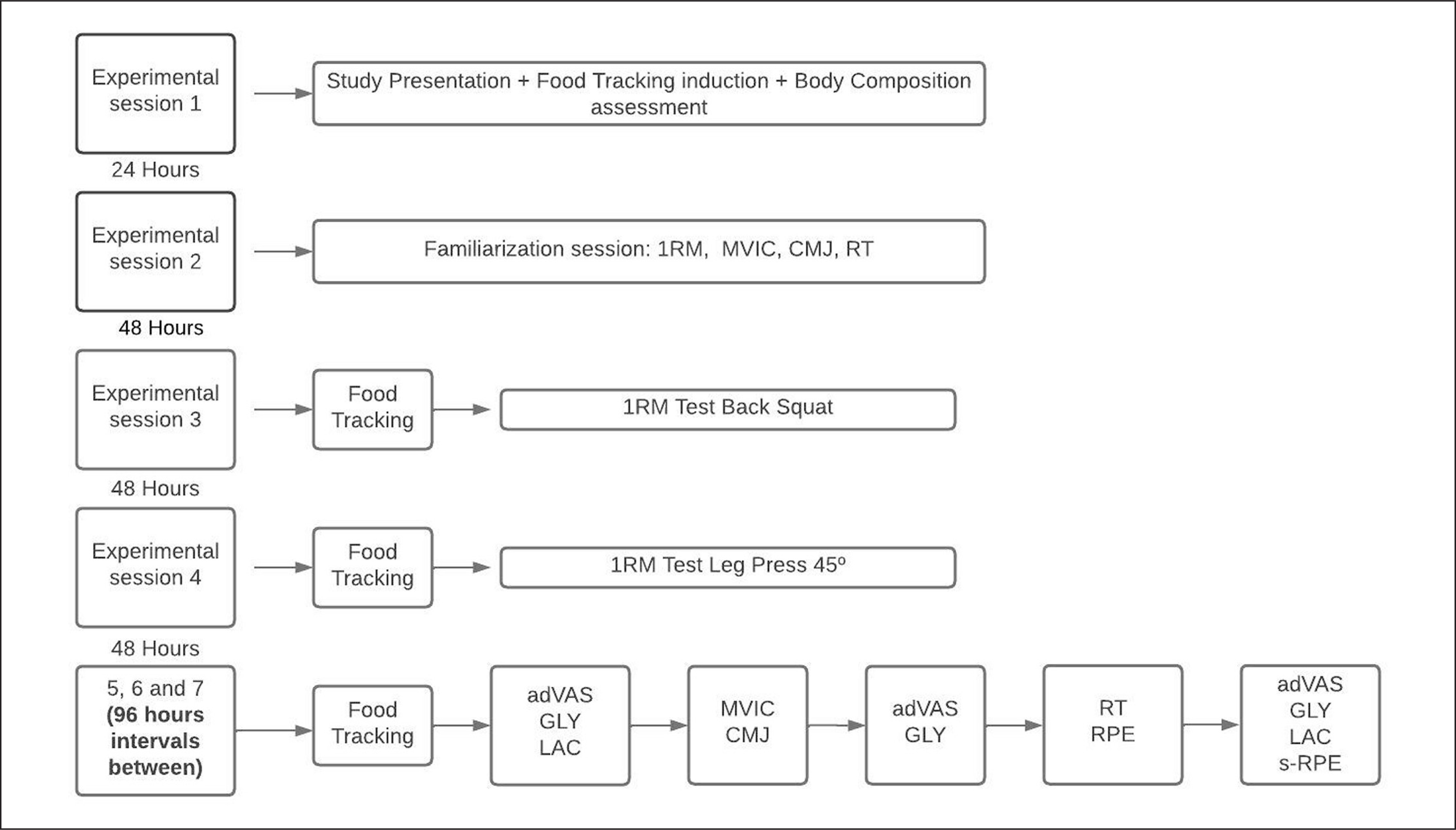 1RM: 1 Repetition Maximum Test; MVIC: Maximum Voluntary Isometric Contraction Test; CMJ: Countermovement Jump Test; FT: Food Tracking; adVAS: adapted Visual Analogue Scale; RT: Resistance Training; GLY: Glycemia; LAC: Lactate concentration; RPE: Rating Perceived Effort; s-RPE: Rating Perceived Effort ater the end of the session.