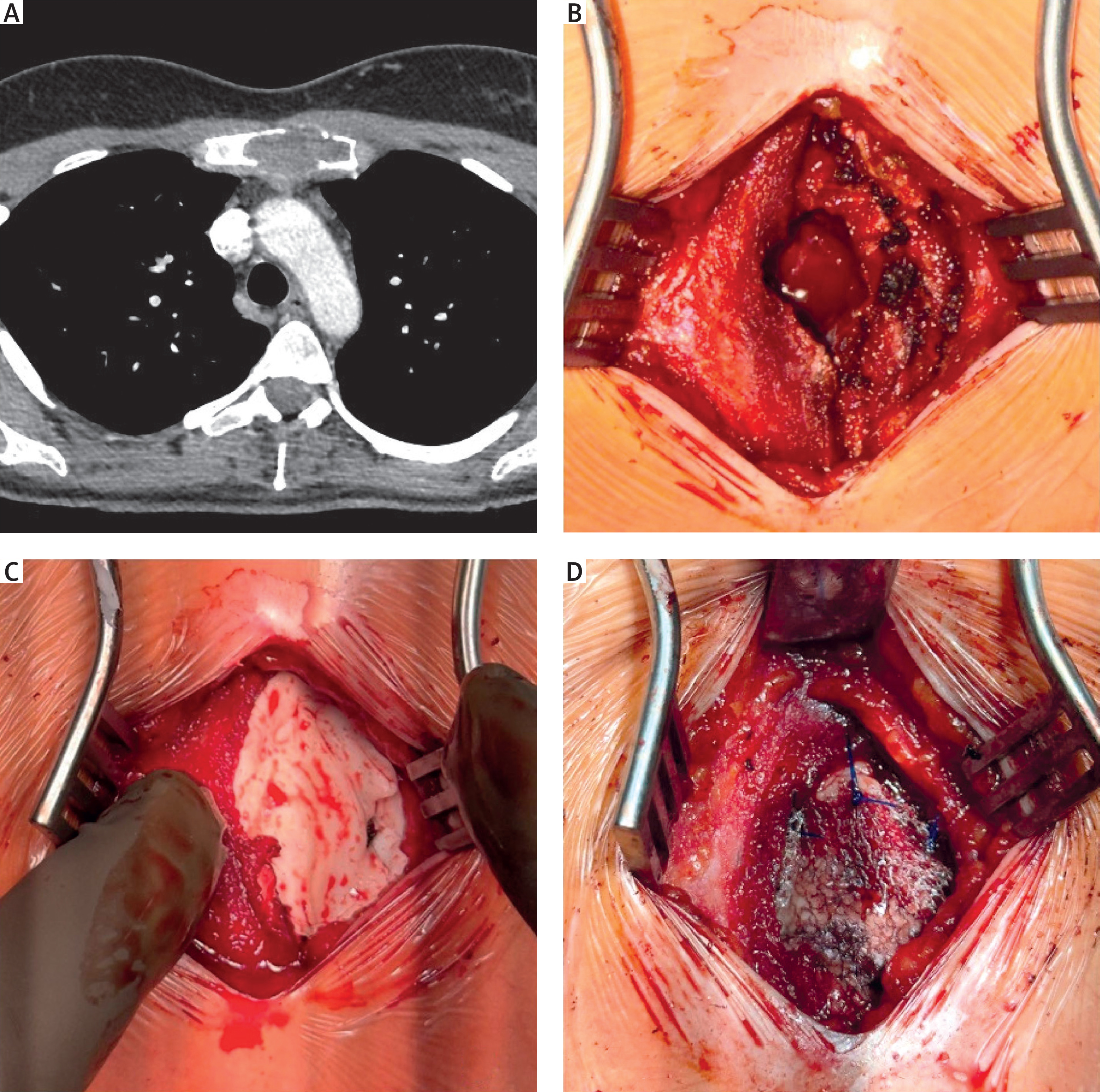 Radiological and intraoperative images. A – Chest computed tomography (CT) scan showing a lesion in the manubrium sterni. B – Intraoperative view of the anterior plate of the sternum with a bone defect. C – Cavity filled with surgical cement mixed with gentamicin. D – Anterior surface of the sternum covered with a mesh fixed with sutures