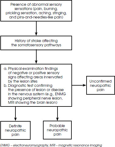 The International Association for the Study of Pain (IASP) defined neuropathic pain as the pain occurring as a direct consequence of a lesion or disease in the somatosensory system [20]. In 2011, The Neuropathic Pain Special Interest Group (NeuPSIG), proposed an algorithm to help diagnose neuropathic pain for both clinical and research purposes. One example of diagnostic workflow, modified from NeuPSIG guideline, can be seen below in Figure II. In CPSP, the affected area is commonly contralateral to the lesion in the central nervous system [30]. Neuroimaging is recommended to identify the lesion site; however, it is not used to confirm the diagnosis of CPSP [23].