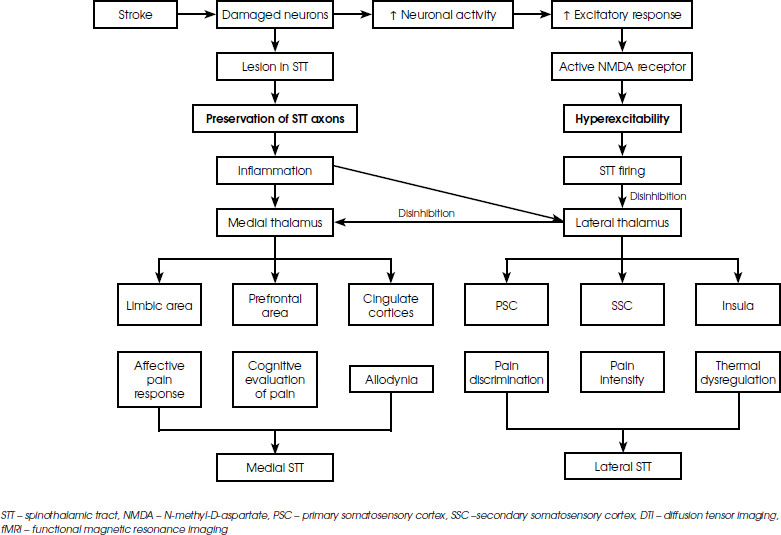 There are two recent theories explaining the development of CPSP. The first focuses on the presence of lesions along the ascending somatosensory pathways causing the generation of pain, whereas the second theory explores the imbalance between the excitatory and inhibitory inputs in the systems involved [28, 29]. It is very possible that in patients with CPSP both of these abnormalities occur simultaneously. When an injury happens to the spinothalamic tract, resulting in the preservation of spinothalamic tract instead of disruption, the damaged axons release inflammatory substances. These substances will act as a pain input to the adjacent healthy axons triggering hyperexcitation of the thalamus which increases the brain excitatory response and intercepts with its inhibitory regulation. This disinhibition alters the medial spinothalamic tract pathway, leading to burning sensation experienced by patients. Another theory about central sensitization, proposed the role of excitatory amino acids which send the N-methyl-D-aspartate (NMDA) receptors into overdrive. Increased activity of the NMDA receptors in the cortex or thalamic area will later produce spontaneous pain. One study found alterations in the fibre characteristics in the spinothalamic tract and superior thalamic radiation in post-stroke patients [28]. Lesions along the spinothalamic tract, seen in multiple sclerosis patients with plaques accumulating in the brainstem or thalamus, have been known to induce central neuropathic pain [29]. Figure I describes the development of CPSP in post-stroke patients and clinical manifestations corresponding to the affected spinothalamic tract [30].