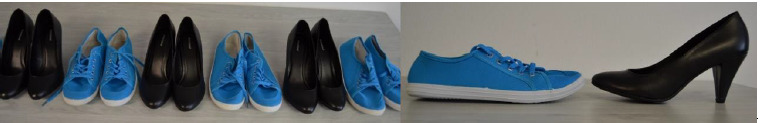 Data were collected for each subject during a single session. At the beginning of each trial, the system for measuring in-shoe pressure was calibrated when standing on one leg separately for each shoe in accordance with the manufacturer’s recommendations (Pedar-X). Subjects had the possibility of walking on a treadmill in both types of shoes for 3 minutes before the test started. Data were collected during 30 seconds while the subjects walked on the treadmill at the pre-set walking speeds of v1=0.97 m.s-1 and v2=0.56 m.s-1. Walking speeds were chosen based on a pilot study to determine which treadmill walking speed was most comfortable and safest for research participants. The monitored values were first measured while walking in flat shoes without heels (FS), and afterwards in high heel shoes with a heel of 7 cm (HH). The comparative experiment aimed to discover the correlations among variables recorded (STANCE, SWING, STRIDE and the frequency of steps) when walking in two types of shoes (HH and FS – Figure 1), at walking speeds of v1 and v2.