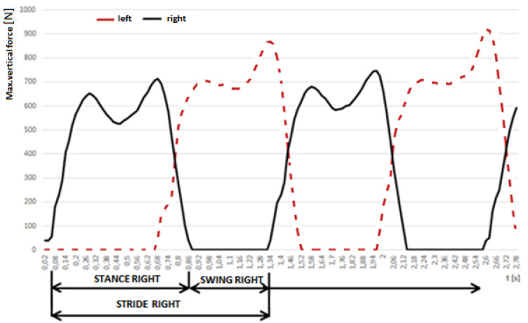 Temporal variables from each step (STANCE – [s]), swing phase (SWING – [s]), duration of the stride (STRIDE – [s]) and frequency of the steps per minute (FRE – [step/min]) were processed by software (Novel, Germany) based on the values of maximal peak pressure (PPmax) and maximal vertical force (MVFmax) (Figure 3).