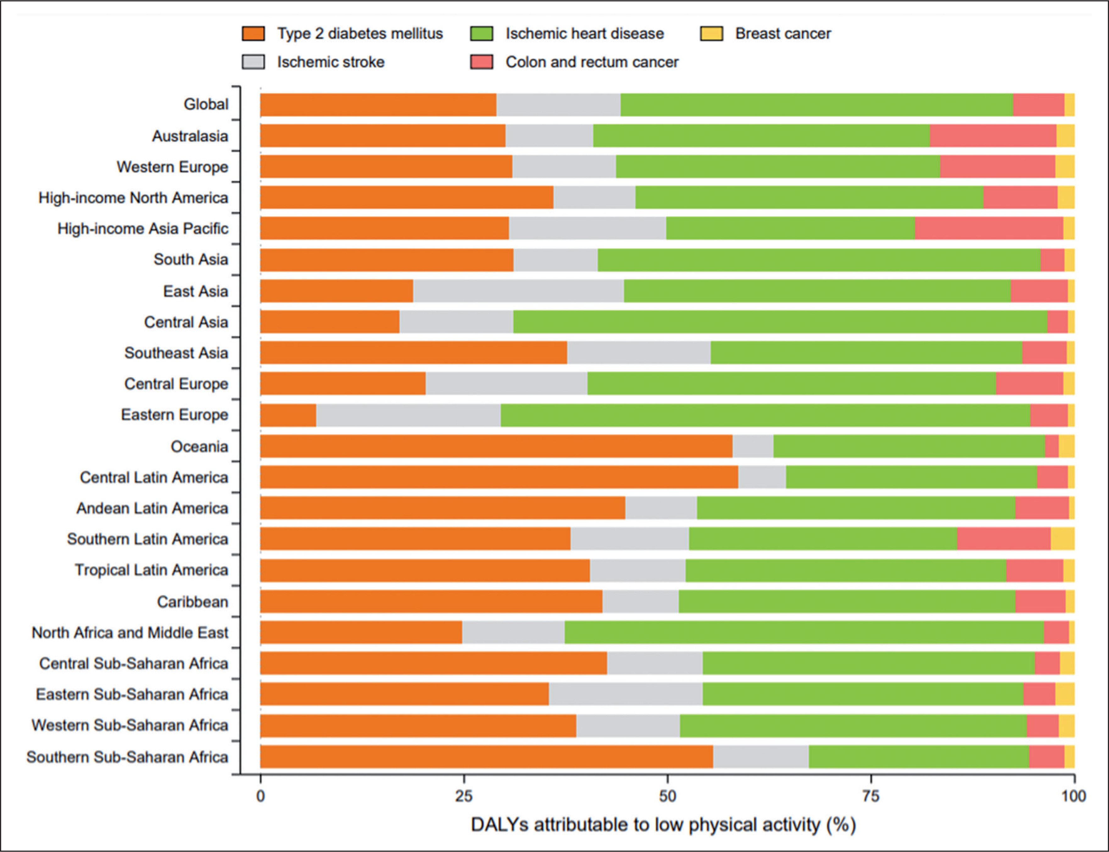 Current public health goals focus on reducing disease burden by extending “healthspan”, and providing extra years spent free of chronic conditions. The highest 2019 age-standardized rates of low-PA-related DALYs (per 100,000 people) seen in North Africa and Middle East (≈ 672), Oceania (≈ 512), Tropical Latin America and Caribbean (≈ 440), central Asia (≈ 317), and Southern Sub-Saharan Africa (≈300), as well as, alarming increases (1990-2019) in low-PA-related DALYs seen in most of Oceania (33.1%), central Asia (30.7%), Southern (25.7%) and Western (10.6%) Sub-Saharan Africa, and Southeast Asia (21%) countries indicates an urgent need for the development, implementation and fostering of an anti-low PA action plan in these regions. Previous reports estimate that decreasing inactivity by just 10% could prevent more than 533,000 deaths/year; this number is projected rise to over 1.3 million through a 25% reduction [6]. Therefore, disseminating appropriate PA recommendations especially in population subgroups that are most vulnerable to low-PA-related disease risk, becomes crucial.