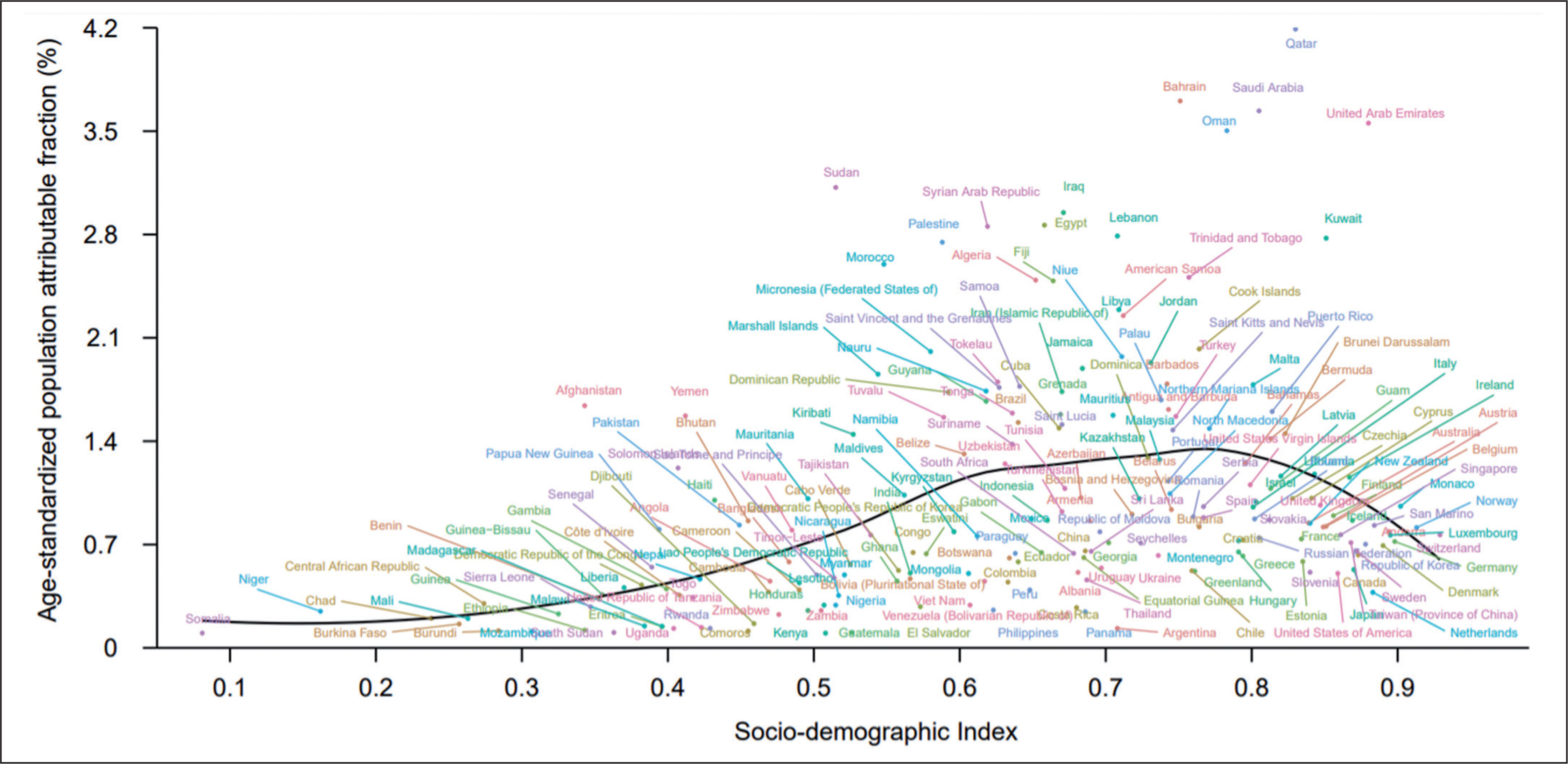 Of all age-standardized DALYs globally in 2019, 0.6% (95% UI 0.3 to 1.1) was attributable to low PA (Table 1). By SDI quintile, only countries in the high-SDI quintile had decreased proportions of age-standardized DALYs attributable to low PA during 1990–2019, while countries in other SDI quintiles had increased proportions in the same timeframe (Table S1). Fig. 4 depicts the changes in the attributable proportions across the 21 GBD regions by SDI from 1990 to 2019. Similarly, only the 4 regions with the highest SDI had decreased proportions of age-standardized DALYs attributable to low PA during 1990–2019, while other regions tended to have increased proportions (Fig. 4). Fig. 5 shows the association between SDI and the proportions of age-standardized DALYs attributable to low PA across 204 countries and territories in 2019. Across all countries and territories, as SDI increases, the proportions of age-standardized DALYs attributable to low PA tended to increase until SDI is about 0.77, but then decreases with higher SDI. Qatar, Bahrain, Saudi Arabia, and many other countries had much higher proportions of age-standardized DALYs attributable to low PA than expected based solely on SDI.