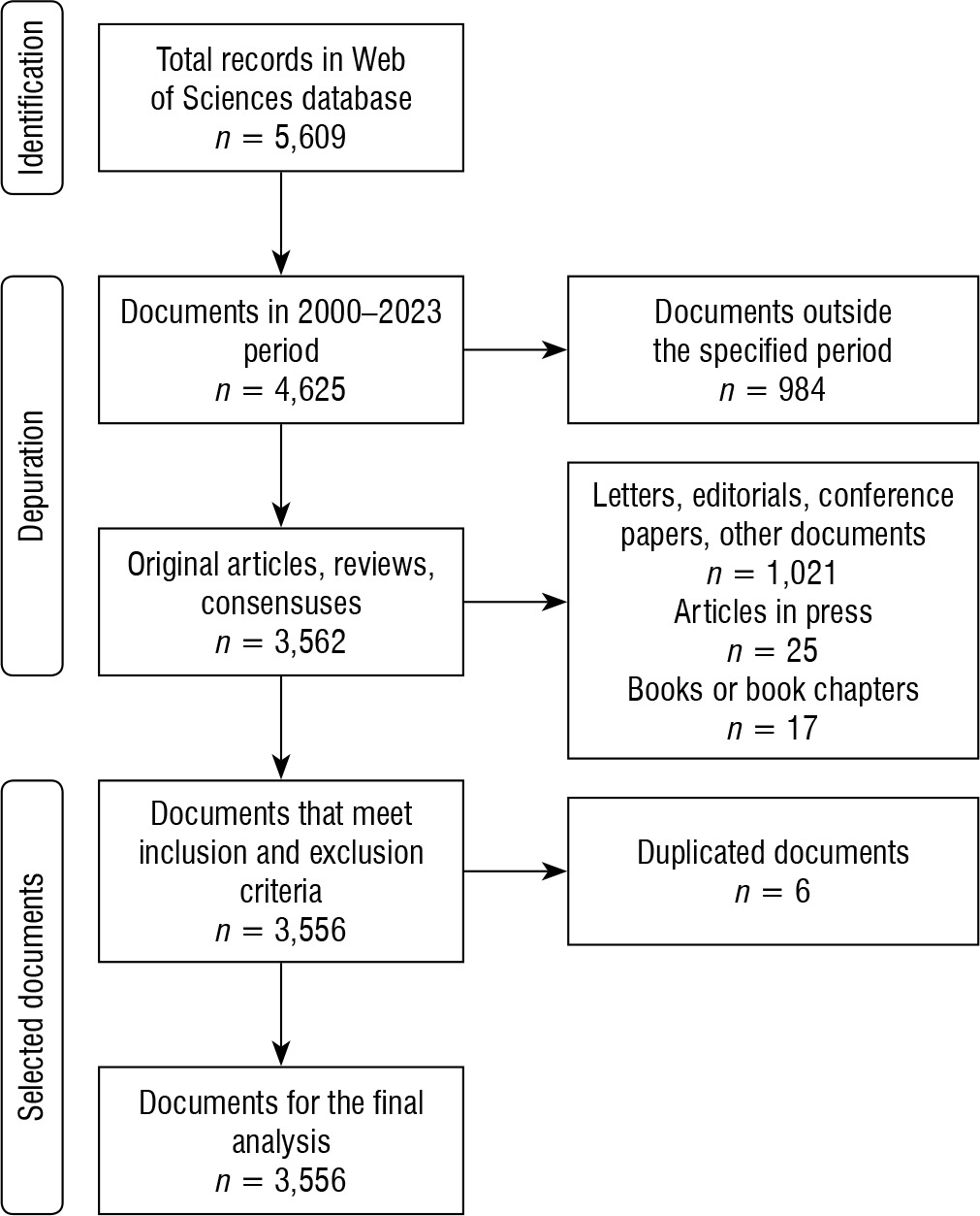 Included were studies specifically addressing the topic of “precocious puberty” as a central theme, whether as research or review articles. Thus, only original articles and review articles (umbrella, narrative, systematic, or scoping) were included, along with consensus statements and clinical practice guidelines published in peer-reviewed journals. Only studies published during the period 2000 to 2023 were included, preprints, editorials, and conference abstracts were excluded, and only studies finally published in journals indexed in WoS were considered (Fig. 1).