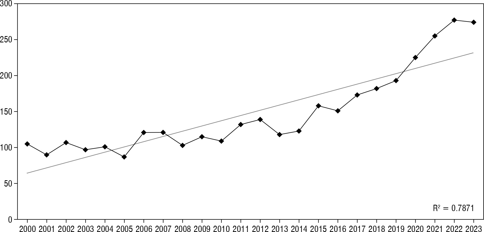 Annual scientific production on precocious puberty in Web of Science during 2000–2023. A coefficient of determination of 0.7871 is observed (p < 0.001)
