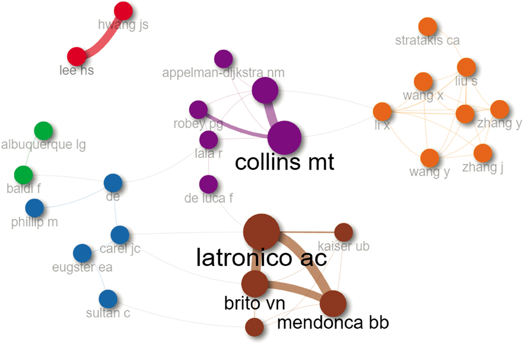The most prolific author is Collins MT with 55 articles addressing the topic of “precocious puberty”, followed by Latrónico AC with 50 and Boyce AM with 44 (Supplementary Material). On the other hand, the author collaboration network indicates well-defined clusters of collaboration, with the largest being the collaboration group between Latronico AC, Brito VN, and Mendonca BB; and Collins MT, Boyce AM, and Robey PG. The collaboration network among authors from the People’s Republic of China is well-defined, although they do not have as many collaborative documents among themselves as the groups mentioned previously (Fig. 4).