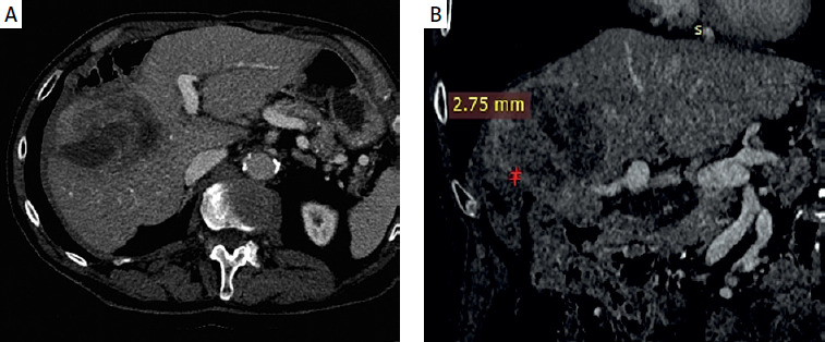 A – Baseline contrast-enhanced axial computed tomography (CT) with a 9.7 cm colorectal liver metastasis. B – Baseline contrast-enhanced coronal CT with the distance from the colon