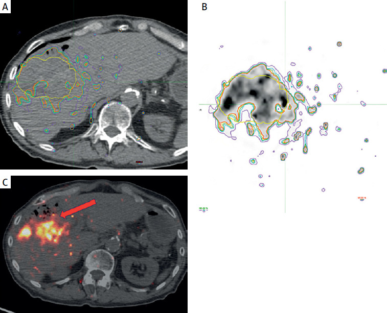 After multidisciplinary review, the decision to perform ablative RL with Y-90 resin microspheres (SIR-Spheres) was made. Pre-treatment work-up was performed and a dose of 500 Gy was planned for the tumor based on the partition model. Post-treatment dosimetry, performed using MIM Sureplan software, confirmed a mean absorbed dose of 463 Gy to the tumor, 215 Gy to the 5 mm margin, and 122 Gy to the 10 mm margin (Figure 2).