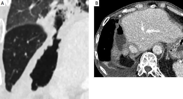 A – Contrast-enhanced CT coronal plane showing hepatopleural fistula. B – Contrast-enhanced CT axial plane showing hepatopleural fistula with fluid and gas
