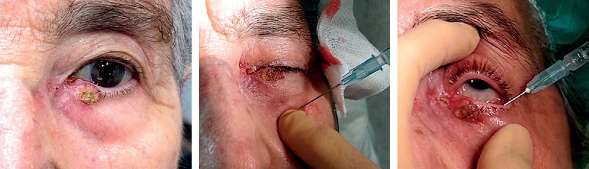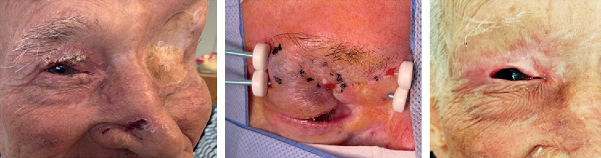 Eyelid carcinoma is a rare but highly visible tumor, thus usually detected at early stages. Malignant eyelid neoplasms account for less than 3% of all skin cancers in the head and neck area [1]. A persistent, slow-growing lesion that does not respond to topical treatments, requires biopsy by an ophthalmologist. Most cases are basal cell carcinomas (BCC), while squamous cell carcinomas (SCC) or sebaceous carcinomas are occurring less commonly [2]. First treatment option for eyelid carcinoma is an excision with clear margins, aiming at preserving eyelid function. Mohs surgery or wide excision are the primary treatments, achieving local control rates of 95-98% [3]. However, these options can lead to several adverse effects, particularly in cosmetic and functional aspects [4].