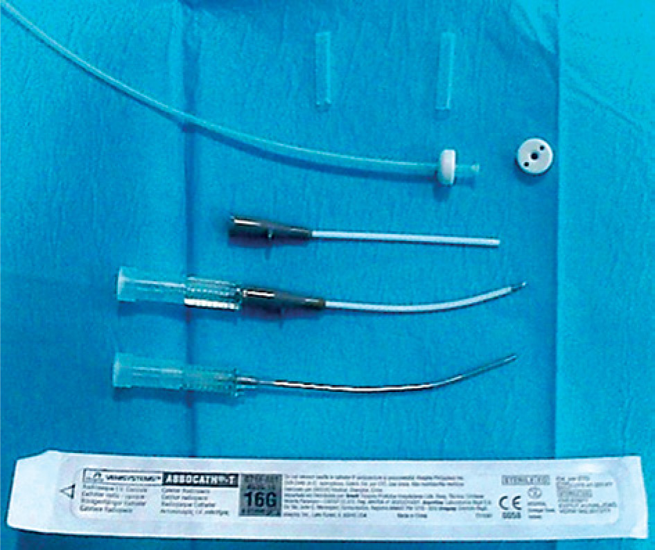 In the next step, a 6F plastic tube (2 mm thick) is inserted, with a thin guidewire and a button at the end, from the tip of the open needle. The needle is carefully withdrawn until the plastic tube remains in place. Another button is added to the outer end to secure the plastic tube, as is done in other locations, such as breast BT. The remaining needles are also replaced with plastic tubes. The button can be changed before insertion with a plastic guidewire that holds it in place for greater comfort (Figure 4). In a larger tumor, a third needle may be required, forming a triangle with two needles inserted previously, using a small template with pre-drilled holes to secure the system. However, this is usually not necessary as larger tumors should be removed, and it is preferable to perform BT in the scar if the margins are compromised.