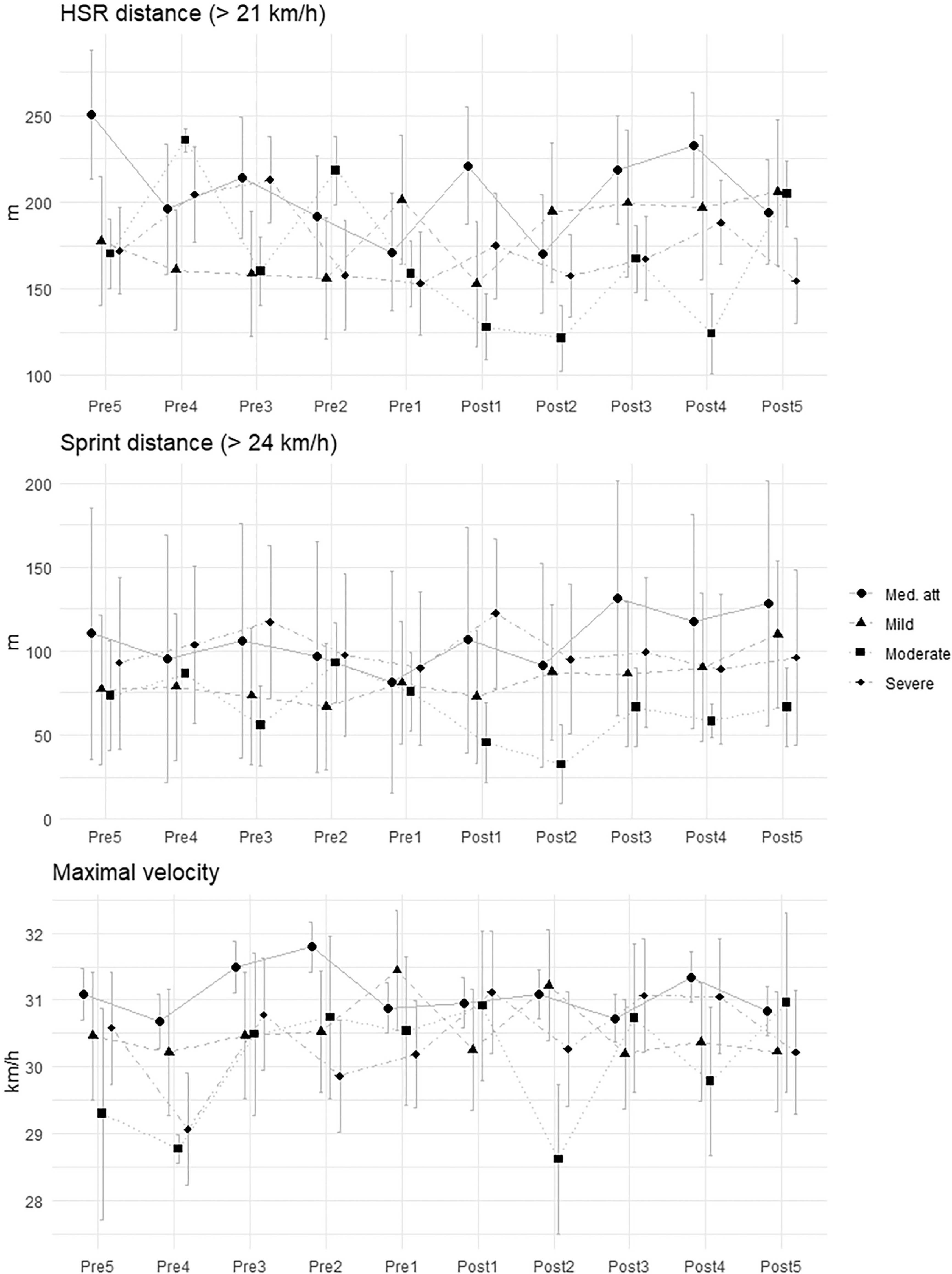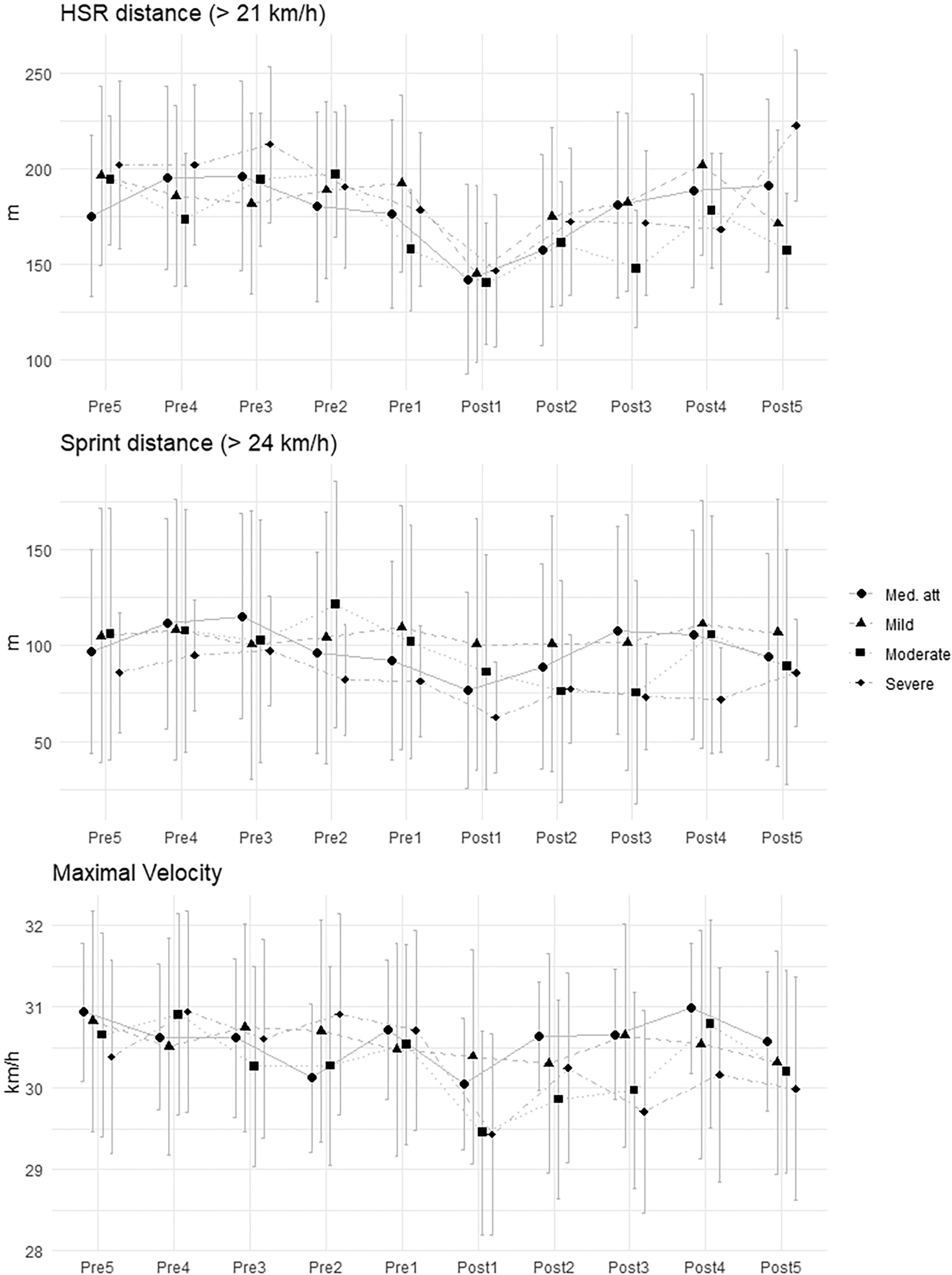 Similarly, the day the injured player completed their first training session with the team or participated in an official match for at least 60 minutes was taken as the reference day for RTP. From this point, time windows were established in the same manner but were referred to as Post. Thus, Post1 corresponds to the reference day mentioned above until the 7th day after it, Post2 from the 8th day to the 15th day, Post3 from the 16th day to the 23rd day, Post4 from the 24th day to the 31st day, and Post5 from the 31st day to the 38th day. To avoid bias with the number of TS included in each time window, the analysis was developed using the average load of that period for HSR, Sprint, and Vmax reached within the time window. Furthermore, at least two maximal sprints were performed in each time window to ensure maximal values were achieved independently of the requirements of competitions and training.