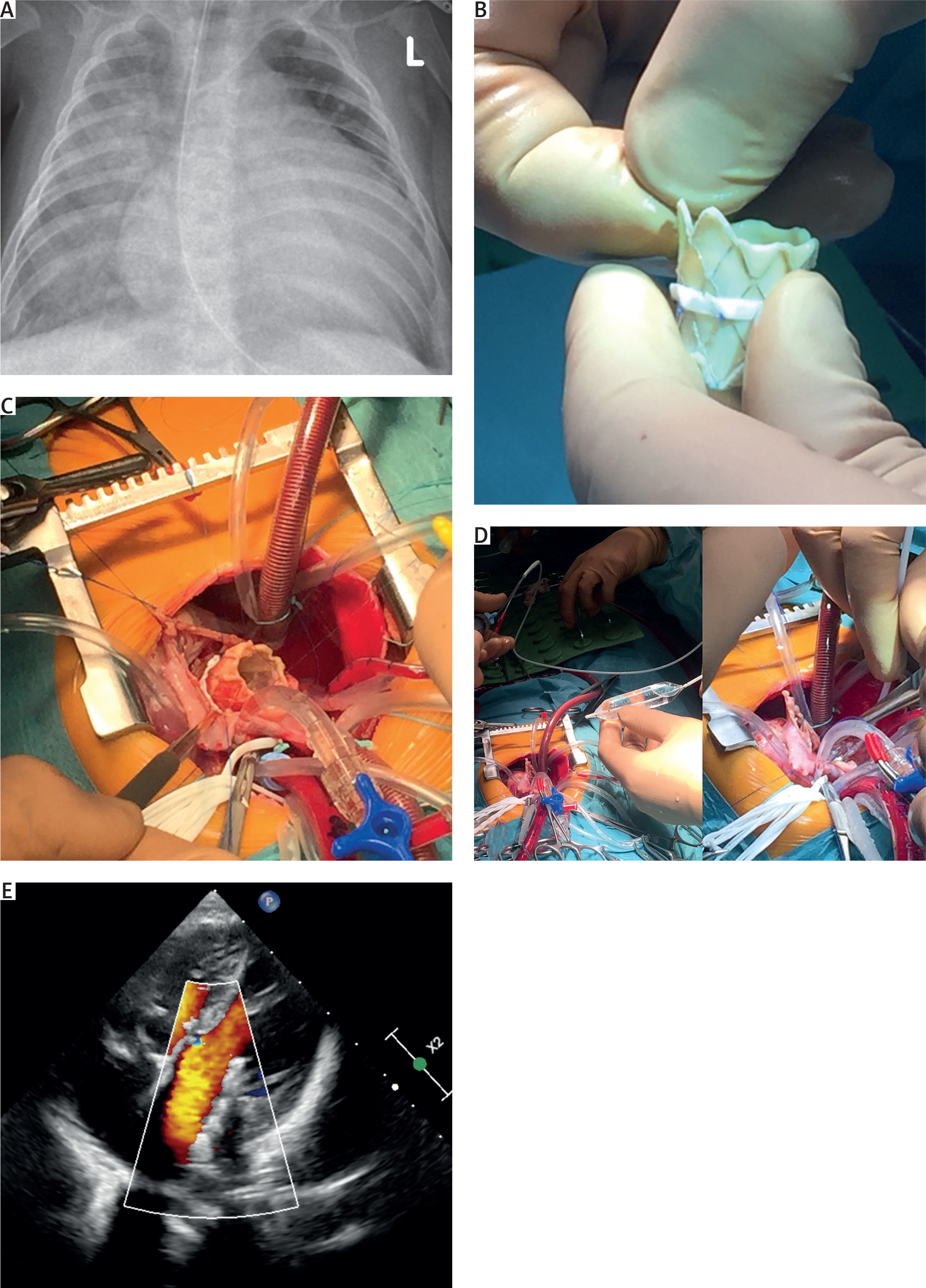 The child was admitted to the pediatric cardiac surgery unit in critical general condition, nasally intubated, with borderline decompensation, hepatomegaly and peripheral edema (Figure 1 A). Preoperative echocardiography confirmed CAVSD with moderate central regurgitation of the common atrioventricular (AV) valve and a single papillary muscle present in the left ventricle with atrophy of the left posterior leaflet. The patient was referred for high-risk correction of the CAVSD with primary hybrid inverted MELODY valve implantation in the LAVV position with PA debanding and balloon dilatation of the pulmonary stenosis (Figure 1).