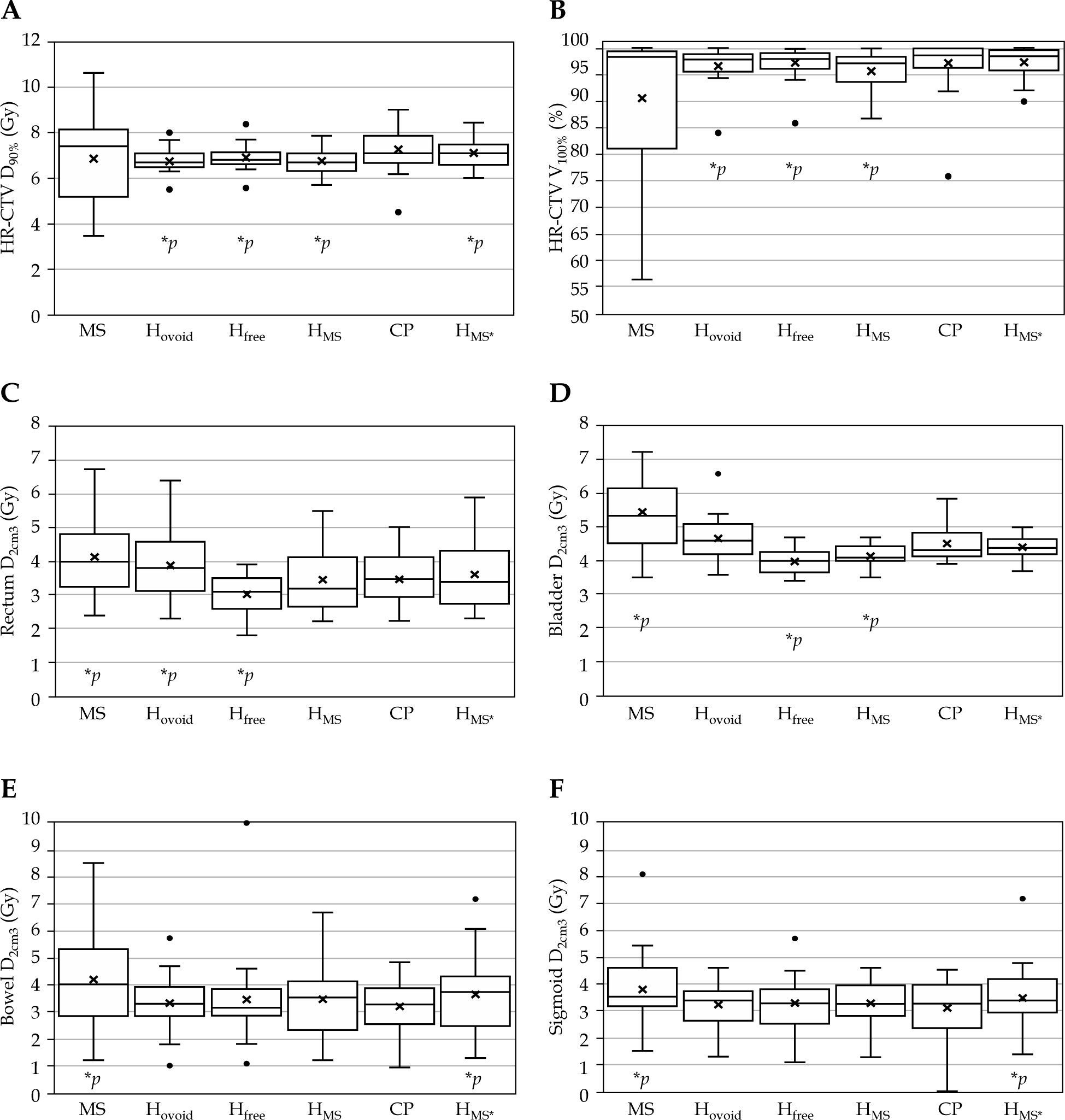 Figure 3 presents the box-plots for the HR-CTV D90% as well as the rectum, bladder, bowel, and sigmoid D2cm3 in a single BT plan. Given that the HR-CTV V100% is a parameter commonly used in clinical practice, it was added to Figure 3. The MS plans exhibited substantial variations in HR-CTV D90% and V100%, with concern remaining for inadequate dose coverage and high OARs doses (particularly for the bladder, bowel, and sigmoid) compared with those in the HIPO and clinical plans. The median dose of HR-CTV D90% for HMS and CP was 6.7 and 7.1 Gy, respectively, corresponding to a discrepancy of approximately 0.4 Gy (p < 0.05). Accordingly, the optimization parameter for HR-CTV D90% was adjusted to 6.4 Gy to generate HMS* (see annotation 1 in Table 4). For the HIPO plans (Hovoid, Hfree, HMS, HMS*), the dose coverage to HR-CTV improved compared with that of the MS. As for OARs, Hfree exhibited the lowest doses. However, some cases revealed dose distributions deemed clinically unacceptable. HMS* could improve the dose coverage to HR-CTV through adjustment of the optimization parameter. Importantly, although the dose coverage to the target improved, no significant increase in OARs doses was observed.