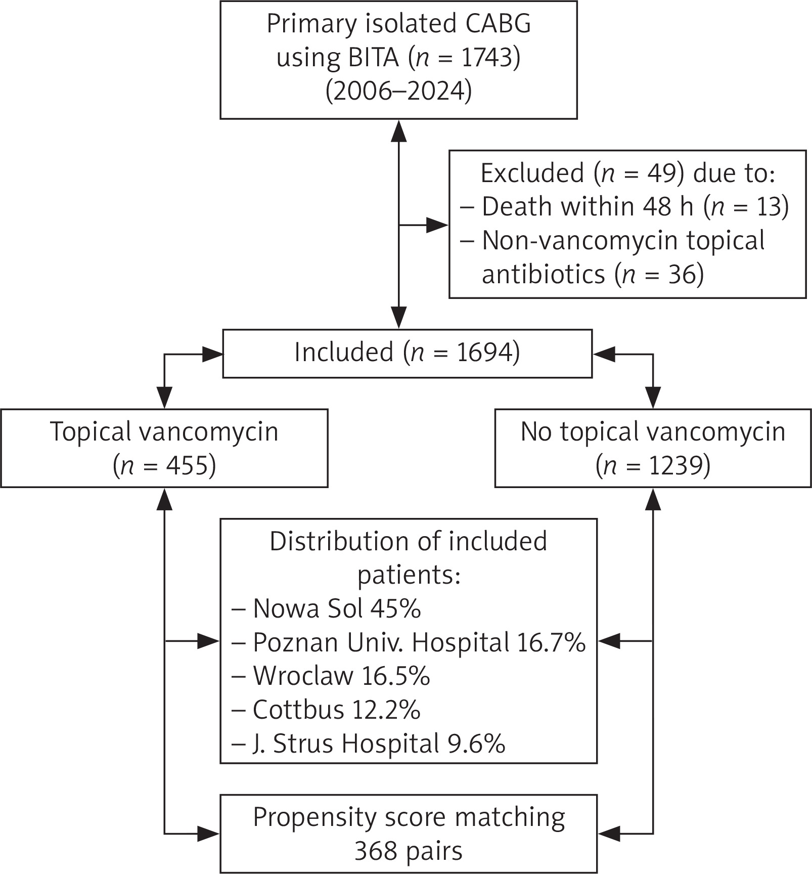 This observational, retrospective study was designed in accordance with STROBE (Strengthening the Reporting of Observational Studies in Epidemiology) guidelines [22]. Between January 2006 and December 2024, 1,743 patients who underwent primary isolated CABG using BITA, with or without additional grafts, were analyzed retrospectively at five centers: Zbigniew Religa Heart Center “Medinet”, Nowa Sol, Poland; Zbigniew Religa Heart Center “Medinet”, Wroclaw, Poland; Sana Heart Center, Cottbus, Germany; J. Strus Hospital, Poznan, Poland; and Poznan University of Medical Sciences, Poland. Data were collected retrospectively from the surgical database at each center. This database captures detailed information on preoperative, intraoperative, and postoperative variables for all patients undergoing cardiac surgery. Patients were grouped according to whether topical vancomycin paste was applied to the sternal edge (n = 455) or not (n = 1239).