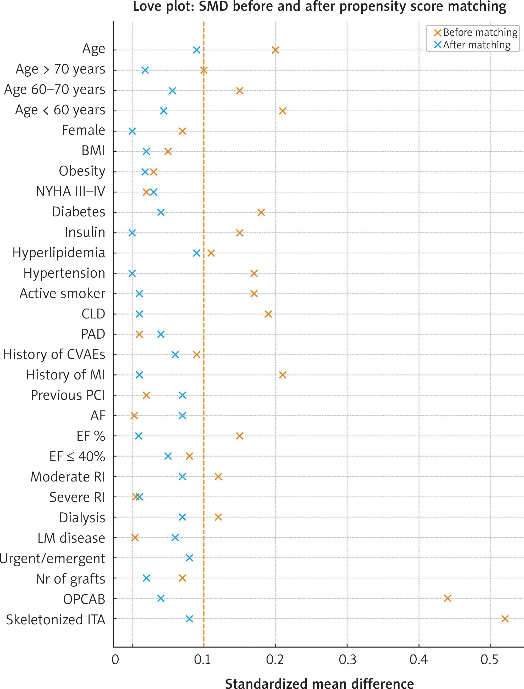 AF – atrial fibrillation, BMI – body mass index, CLD – chronic lung disease, CVAEs – cerebrovascular adverse events, EF – ejection fraction, ITA – internal thoracic artery, LM – left main coronary artery, MI – myocardial infarction, NYHA – New York Heart Association functional classification, PAD – peripheral artery disease, PCI – percutaneous coronary interventions, PSM – propensity score matching, RI – renal impairment, SMD – standardized mean difference.