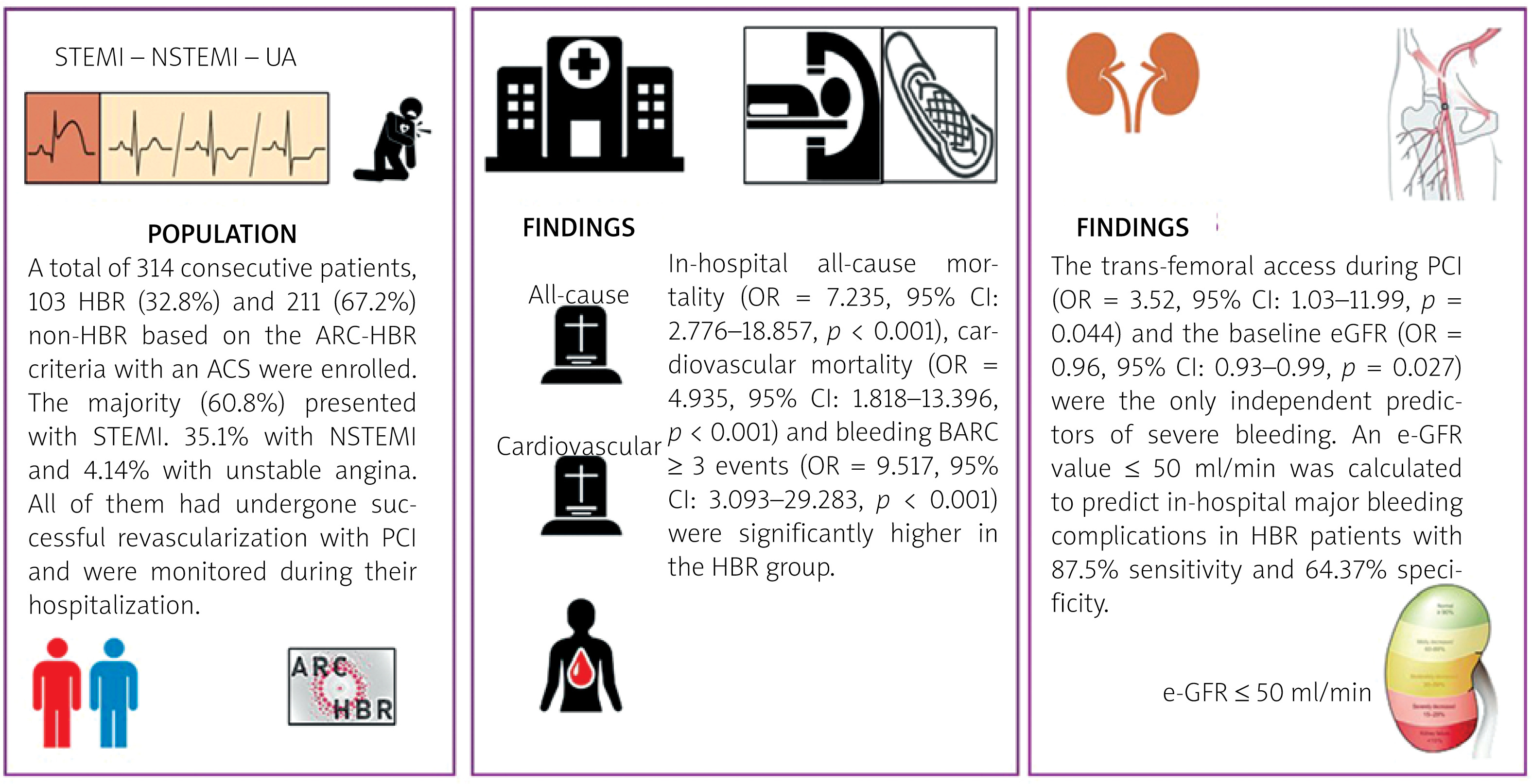 The main findings of our study can be summarized as follows: 1) in this real-world registry, 32.8% of the patients with an ACS who undergo PCI are at high bleeding risk; 2) in-hospital major bleeding events, all-cause mortality and cardiovascular mortality are significantly higher in HBR patients with ACS and successful PCI compared to non-HBR; 3) the only factors that can predict in-hospital bleeding BARC ≥ 3 in HBR patients with ACS who undergo PCI are the use of femoral access during the intervention as well as the baseline impaired kidney function; 4) an e-GFR value ≤ 50 ml/min was calculated to predict in-hospital major bleeding events in HBR patients with an ACS and successful revascularization with 87.5% sensitivity and 64.37% specificity; 5) although the choice of the antithrombotic agents was not associated with bleeding events, clopidogrel was more frequently used in HBR patients who were deemed at higher bleeding risk and in HBR patients with severely impaired kidney function (eGFR < 40 ml/min).