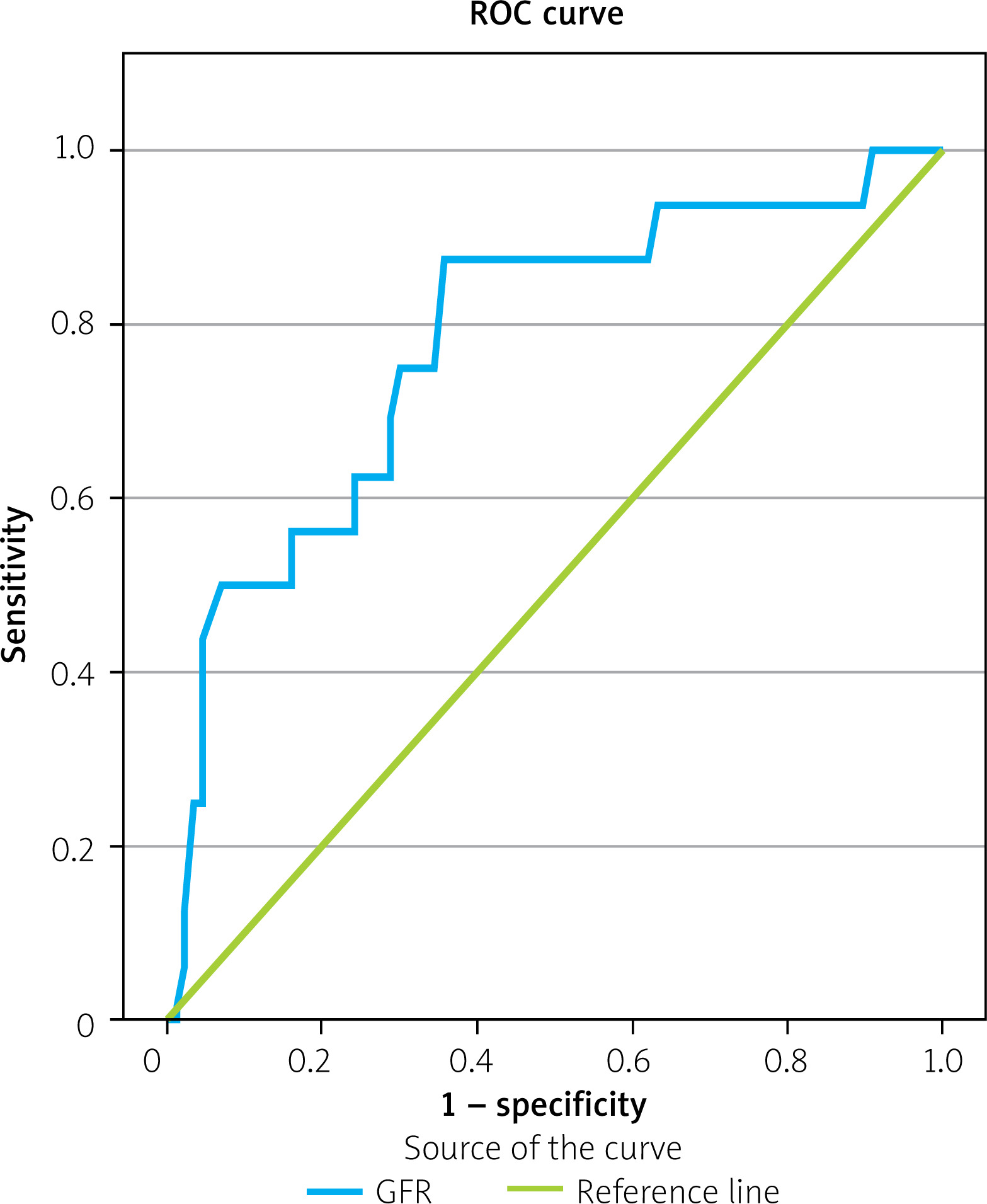 Univariate binary logistic regression analysis was performed to detect possible predictors of in-hospital bleeding (BARC ≥ 3) in HBR patients. Only trans-femoral access in PCI and eGFR were statistically significant (Table IV), and these predictors were included in a multivariable model. Both the trans-femoral access (OR = 3.524, 95% CI: 1.035–11.991, p = 0.044) and eGFR (OR = 0.966, 95% CI: 0.938–0.996, p = 0.027) maintained their significance (Table IV). A ROC curve was plotted to identify the optimal cut-off value of eGFR. The curve displayed a statistically significant AUC value of 0.781 (95% CI: 0.658–0.91, p < 0.001) (Figure 2). The optimal cut-off point for eGFR predictive for bleeding was calculated. An eGFR value ≤ 50 ml/min was found to predict in-hospital major bleeding events in HBR patients with an ACS and successful revascularization with 87.5% sensitivity and 64.37% specificity.