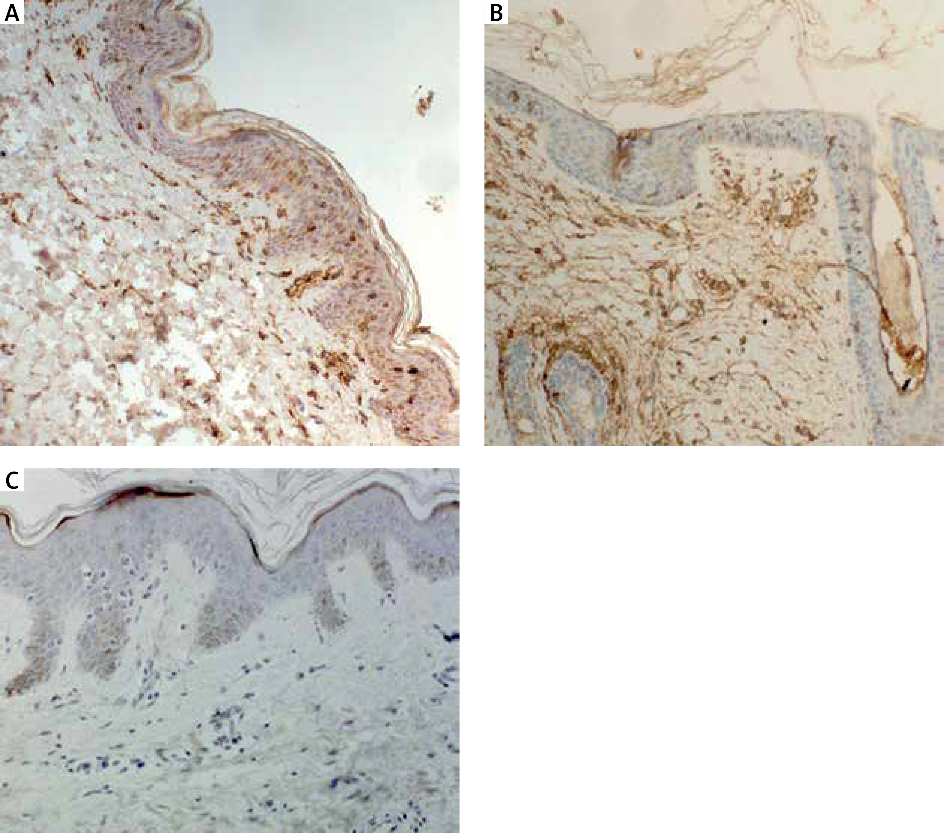 The tissue expressions of S100A7, S100A4 and IL-17 were assessed with an immunohistochemical method. The immunohistochemical reactions was performed on 4 μm-formalin-fixed and paraffin-embedded (FFPE) biopsy specimens using mouse anti-human psoriasin (S100A7) monoclonal antibodies (catalogue number ab13680; Abcam, UK), mouse anti-human S100A4 monoclonal antibody (catalogue number ab218512; Abcam, UK), mouse anti-human IL-17 polyclonal antibodies (catalogue number PA1-84183; Invitrogen, USA) according to the manufacturer’s protocol, with positive and negative control stainings. Detection was performed on the platform Dako using the Dako RDS AP kit (Dako Real Detection System Alkaline Phosphatase Real Rabbit/Mouse, catalogue number K5005). The preparations were assessed using Zeiss Axio Imager A2 light microscope with video track and Zeiss AxioVision software. The expression was considered as positive when the membrane or cell cytoplasmic immunoreactivity was observed. Positively stained cells were counted in 10 fields of view for each specimen preparation at 200× magnification, and the mean value for each preparation was calculated.