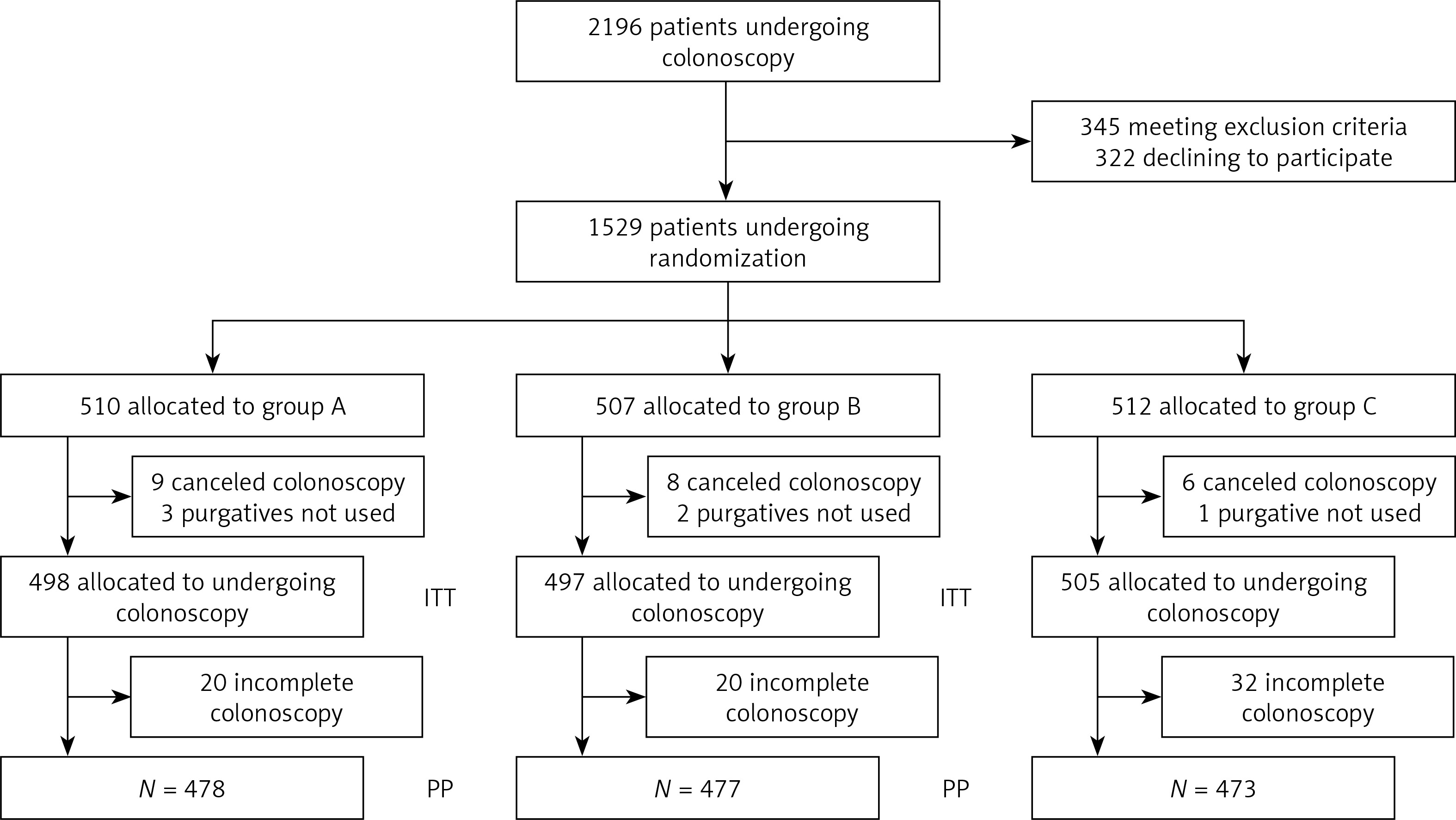 Excluding incomplete colonoscopy, a total of 478 patients in group A, 477 in group B and 473 in group C had colonoscopy and underwent PP analysis. The technical difficulty of incomplete colonoscopy for one reason did not differ significantly, but poor bowel preparation for the other reason did differ significantly among the three groups (p = 0.043) (Table II). The success rate of cecal intubation was 96.0% (478/498) of patients in group A, 96.0% (477/497) in group B, and 93.7% (473/505) in the control group, with no significant differences between them (p = 0.140). Among patients with successful insertion, the rate of adequate bowel preparation (BBPS ≥ 6) was significantly different among the three groups, with a mean BBPS score of 7.5 ±1.2 in group A, 7.5 ±1.3 in group B, and 6.5 ±1.2 in group C (p < 0.001).