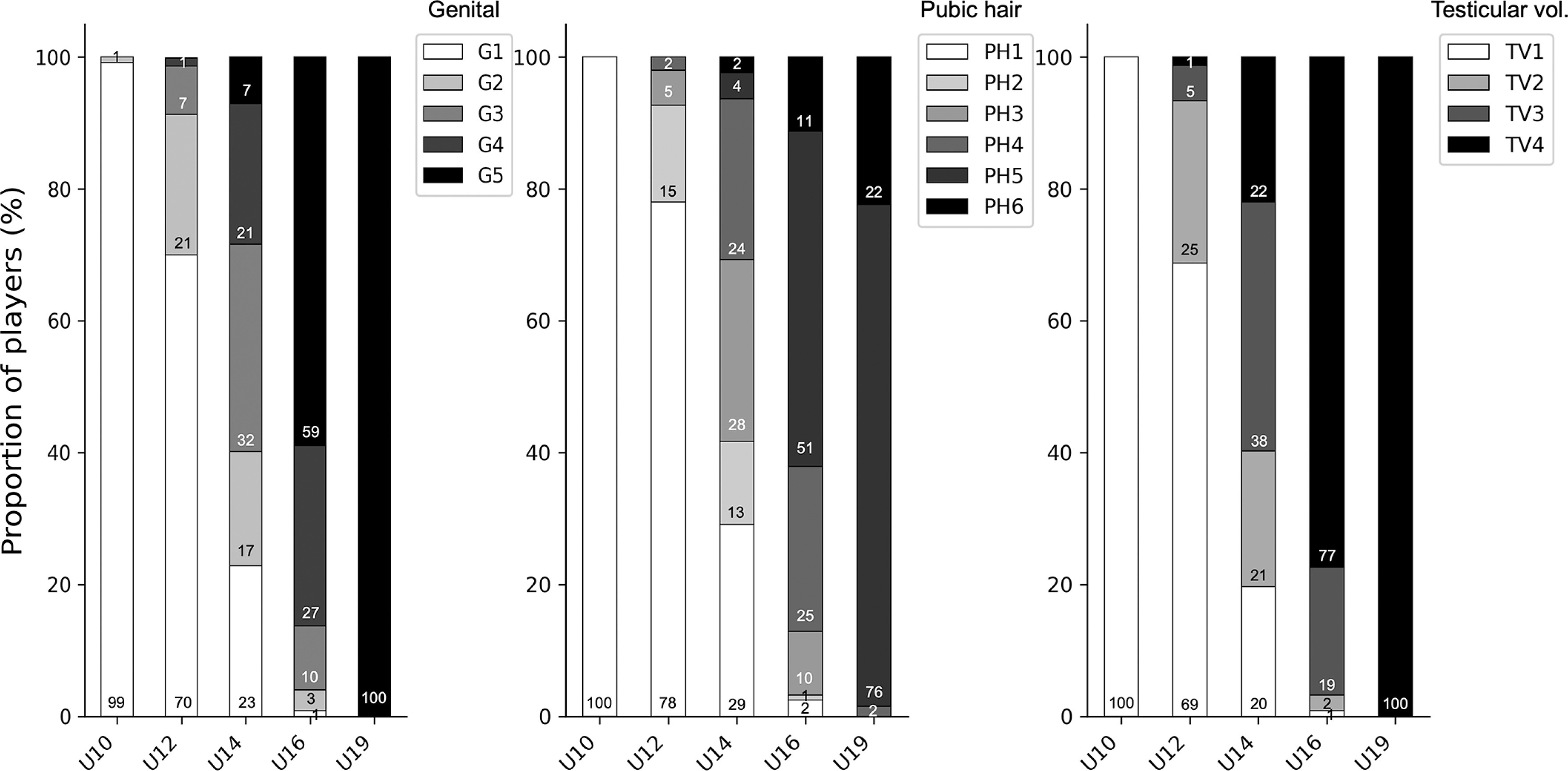 Maturity assessments were available for 595 player-seasons (89% of the total; excluded 17/211 players for 2011/12, 22/219 players for 2012/13 and 36/240 players for 2012/13). The proportion of players classified to each maturity stage is presented per season in Table 1 and within each age group in Figure 1. Across the different maturity indicators, almost all U10 players were in G1, PH1 and TV1 and almost all U19 players in G5, PH5/6 and TV4, with more diversity observed in the U12, U14 and U16 age groups.