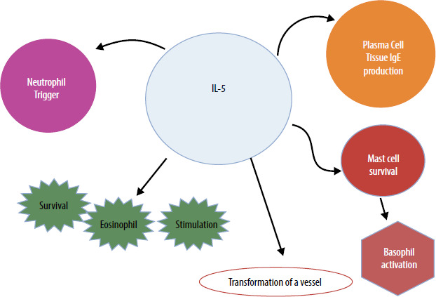 IL-5 plays a key role in the development of severe eosinophilic asthma. Its overactivation leads to an increase in the number of eosinophils, resulting in increased inflammation, damage to the bronchial epithelium, and worsening of asthma symptoms. Therapies that are based on monoclonal antibodies – –mepolizumab, reslizumab or benralizumab – effectively reduce the number of eosinophils and reduce the frequency of asthma exacerbations [35, 36].
