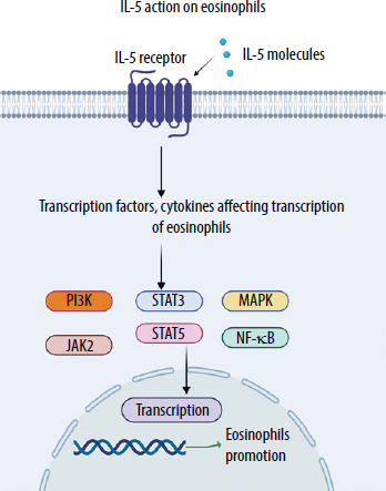 IL-5 is one of the main factors responsible for eosinophilic airway inflammation, which often occurs in severe asthma. IL-5 stimulates the differentiation, maturation, and survival of eosinophils in the bone marrow and promotes their migration into the bronchial mucosa [4]. An excess of eosinophils in the airways leads to epithelial damage, increased mucus production, and increased bronchial activity, which contributes to difficulty breathing and frequent exacerbations of the disease. In addition, IL-5 increases the resistance of eosinophils to apoptosis, which hinders their elimination and prolongs airway inflammation [4, 5]. IL-5 is produced by several cell types, including Th2 lymphocytes, group 2 innate lymphoid cells (ILC2), mast cells, and eosinophils. These cells release IL-5 in response to activation triggered by various environmental stimuli such as inhaled allergens, respiratory viruses, and air pollutants. IL-5 exerts pleiotropic effects on eosinophils, promoting their maturation, activation, survival, migration from the bloodstream, and recruitment to the airways. Additionally, IL-5 influences basophil activation and B cell antibody production, which results in a broader imbalance of the immune system in the progression of severe asthma [7]. Figure 1 shows the pleiotropic effect of IL-5. Figure 2 shows the molecular mechanism of IL-5 action on eosinophils.