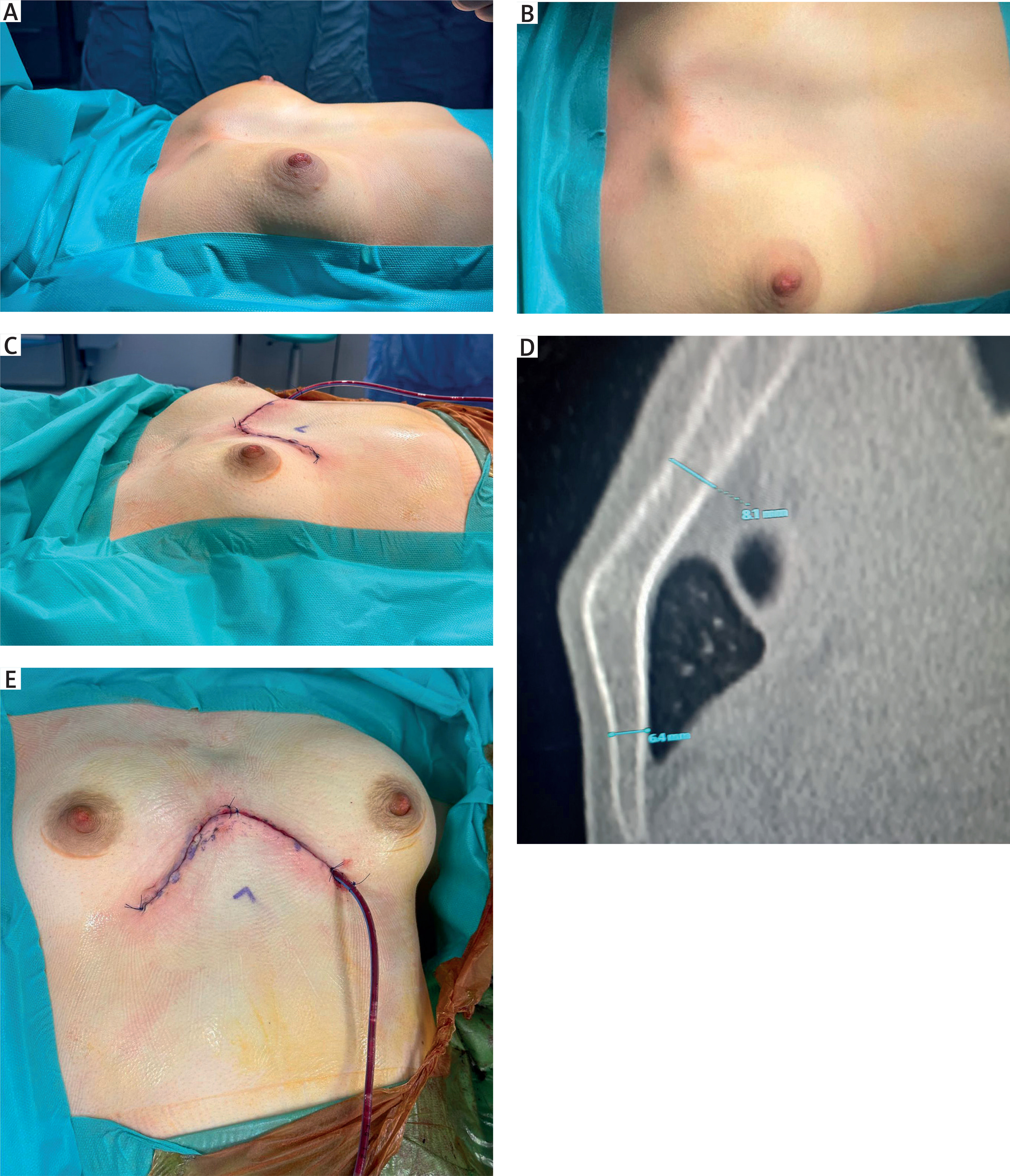 Currarino–Silverman deformity represents a rare and distinct clinical entity among congenital deformities of the sternum and costal cartilages [1]. Its pathogenesis is related to premature fusion of the manubriosternal junction and adjacent sternal segments, resulting in the characteristic anterior protrusion of the chest wall. The deformity typically presents with a shortened, deformed sternum, accompanied by structural abnormalities of the costal cartilages. Most patients remain asymptomatic or report only minimal symptoms. However, in some cases, exertional dyspnea, chest tightness, reduced exercise tolerance, palpitations, or retrosternal pain may occur. The deformity may also coexist with congenital cardiac anomalies, including mitral or tricuspid regurgitation and ventricular septal defects [1]. An important clinical aspect is patients’ satisfaction with the cosmetic appearance of the chest, which is usually the primary motivation for surgical correction. Due to the rarity of this condition and the lack of large clinical trials, no standardized guidelines exist for determining the optimal treatment or indications for surgery. Surgical treatment, most commonly the Ravitch procedure, involving resection of deformed costal cartilages and wedge osteotomy of the sternum with stabilization using reconstruction plates, remains the most effective method of correction. Reported postoperative hospital stays vary from 2.9 to 6.5 days [5]. In the present case, the patient was discharged on the second postoperative day – shorter than typically reported in the literature for Ravitch repairs performed without cryoanalgesia. Although causality cannot be definitively established, intraoperative cryoanalgesia likely contributed to the shortened hospitalization. Post-thoracotomy pain remains a major clinical challenge, impacting not only patient comfort but also the risk of pulmonary complications and the overall duration of recovery. Effective pain control is crucial for maintaining adequate ventilation, promoting early mobilization, and reducing respiratory infection risk. Cryoanalgesia has gained increasing popularity in recent years as a safe and effective method of postoperative pain control in thoracic surgery, including the repair of chest wall deformities such as pectus excavatum by the Nuss technique. Studies have demonstrated that intraoperative cryoanalgesia significantly reduces postoperative opioid requirements and shortens hospital stay [6, 7]. The mechanism of cryoanalgesia involves localized application of extreme cold to induce temporary injury of sensory nerves. This results in reversible axonal degeneration (Wallerian degeneration), temporarily interrupting pain transmission without permanent neural damage. Regeneration of affected fibers typically occurs within several weeks, corresponding to gradual recovery of sensation in the treated dermatomes. Rettig et al. reported that cryoanalgesia in patients undergoing the Ravitch procedure reduced mean hospital stay from 6 to 2.3 days compared with epidural anesthesia, while also decreasing opioid use during hospitalization and follow-up. Notably, despite the slightly longer operative time, total hospital costs were lower in the cryoanalgesia group [5]. In the present case, cryoanalgesia provided sufficient pain relief to avoid opioids entirely. Multimodal analgesia with ketoprofen, metamizole, paracetamol, and preoperative gabapentin contributed to stable postoperative pain control. A recent study by Walendziak et al. explored the concept of performing cryoanalgesia 1 day prior to chest wall surgery, suggesting potential benefits; however, further research in larger cohorts is necessary to validate the efficacy and safety of this approach [4]. The principal limitation of our study is that it presents a single clinical case in which established techniques – modified Ravitch repair and intraoperative cryoanalgesia – were applied. Nevertheless, growing evidence supports the view that cryoanalgesia in thoracic surgery shortens hospital stay and reduces the need for postoperative analgesics. Future prospective studies on larger patient populations are warranted to determine whether intraoperative cryoanalgesia during Ravitch repair for Currarino–Silverman deformity significantly decreases hospitalization time, reduces or eliminates opioid requirements, lowers healthcare costs, and improves overall quality of life.