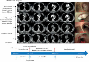 Chest computed tomography (CT) and bronchoscopy images and treatment course of case 2. A) Initial contrast-enhanced CT and bronchoscopy upon admission. A tumor (4.8 cm × 6.3 cm) in the left hilum causing occlusion of the left upper bronchus, tumors in the anterior mediastinum (3.1 cm × 4.4 cm) and the left lower lobe (1.2 cm × 1.2 cm) as well as 90% stenosis of the right main bronchus due to tumor obstruction; B) Contrast-enhanced CT and bronchoscopy following 3 cycles of chemotherapy, and bronchoscopic tumor ablation in the right main bronchus. Enlarged tumor sizes in the left hilum (5.3 cm × 7.4 cm) and the anterior mediastinum (7.9 cm × 5.5 cm), and a new lesion in the left lower lobe (1 cm × 1.4 cm). Again appearing tumor in the right main bronchus; C) Chest CT and bronchoscopy, following iodine-125 seed implantation combined with pembrolizumab treatment for 12 months. Almost complete disappearance of the tumors in the anterior mediastinum, the left hilum, and the left lower lobe, with only seeds left in the anterior mediastinum; reduction of the tumor size in the right main bronchus (RMB); D) Chest CT and bronchoscopy at last follow-up; E) Treatment course of the patient