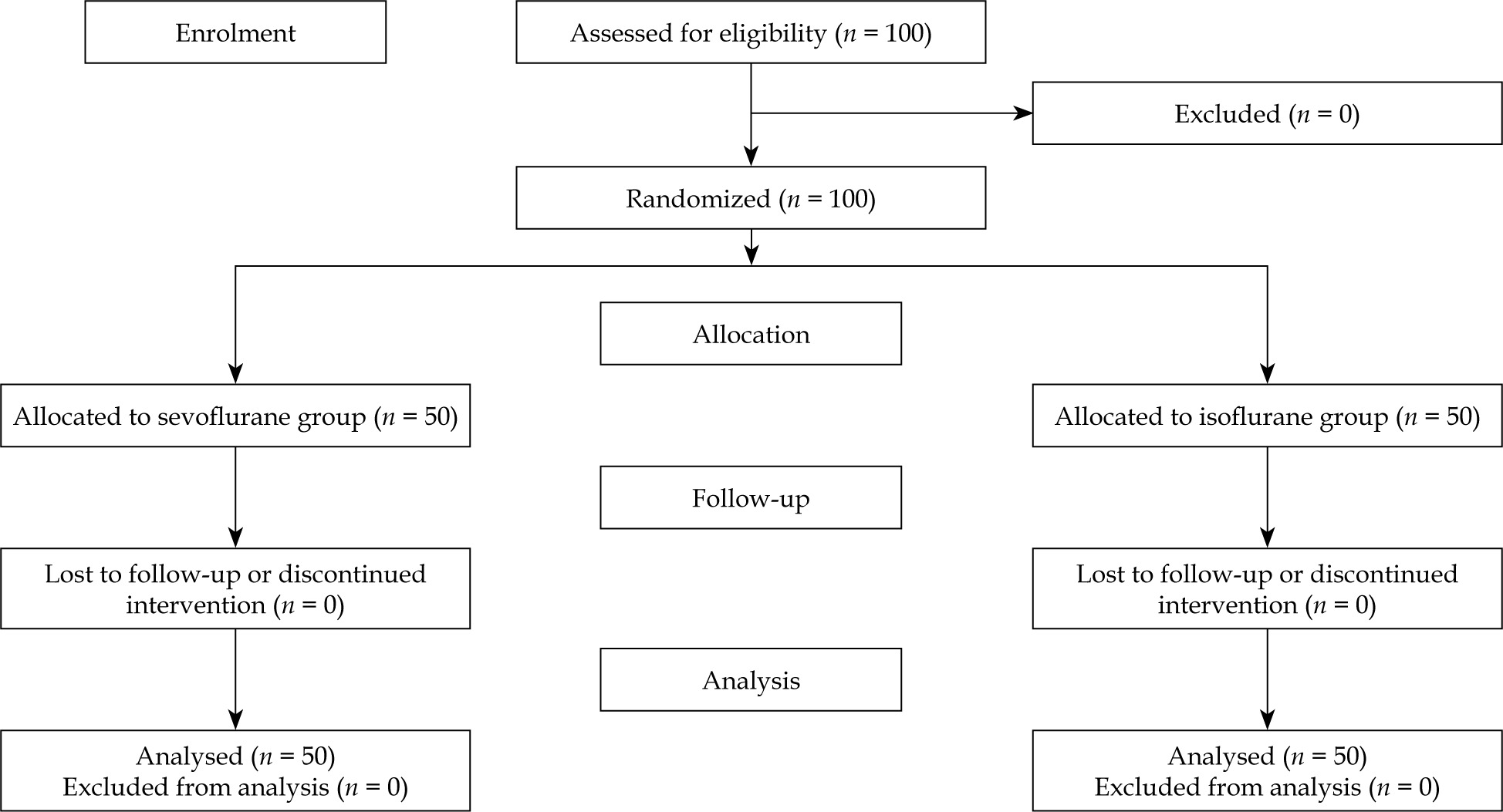Using a computer-generated sequence, participants were randomised in a 1 : 1 ratio to the sevoflurane group (Group S) or the isoflurane group (Group I). Allocation concealment was ensured through the use of sequentially numbered, opaque, and sealed envelopes prepared by an independent investigator. The anaesthesiologist administering the anaesthesia was aware of the group allocation, whereas patients and all postoperative outcome assessors were blinded to the treatment assignment.