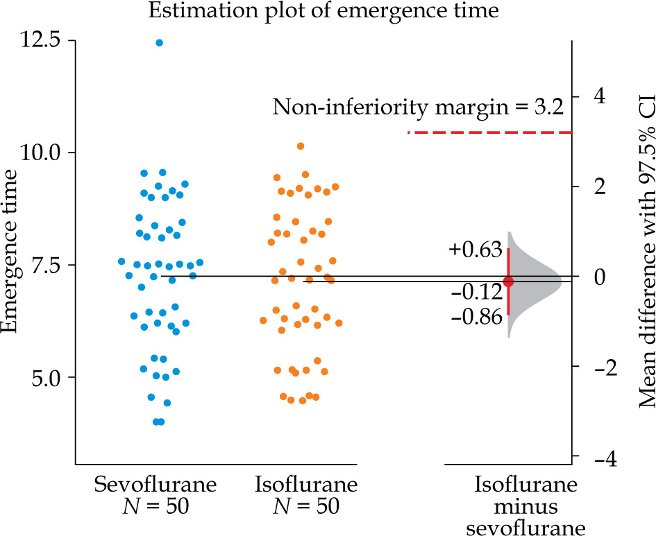Estimation plot of emergence time: individual val ues for sevoflurane (blue) vs. isoflurane (orange; n = 50 each) with group means; right-hand plot shows mean difference (isoflurane − sevoflurane) −0.12 min (97.5% CI: −0.86 to +0.63) and noninferiority margin (3.2 min, dashed line); noninferiority demonstrated with confidence inter val including zero