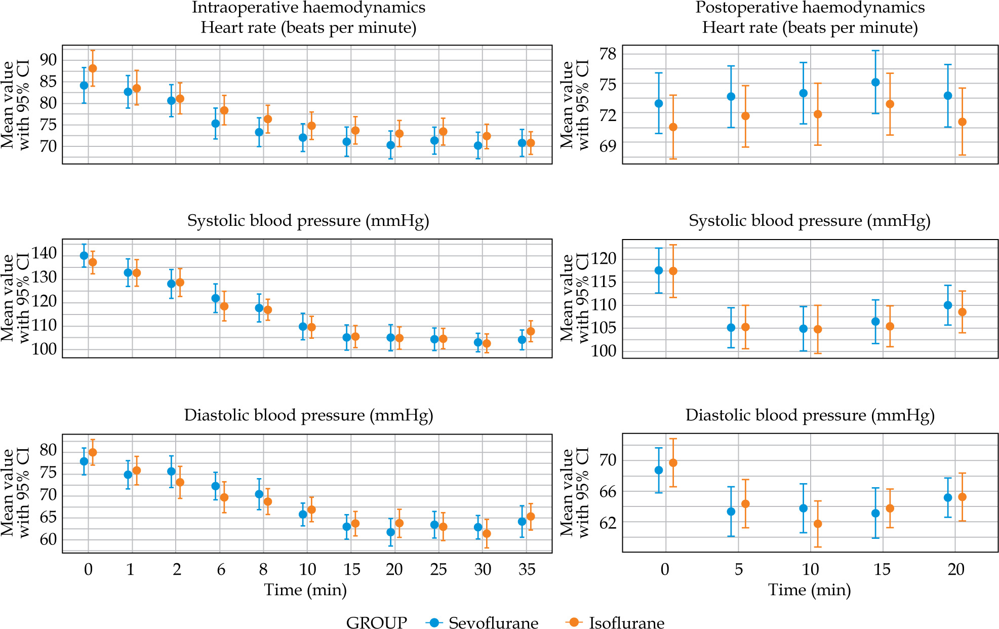 Intraoperative (0-45 min) and postoperative (0-20 min) haemodynamics: heart rate, systolic BP, and diastolic BP for sevoflurane vs. isoflurane as mean ± 95% CI; no statisically significant intergroup differences