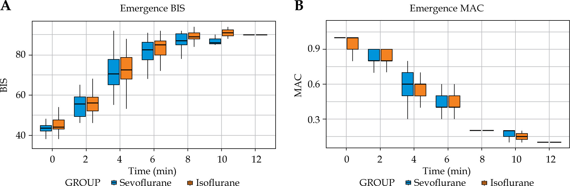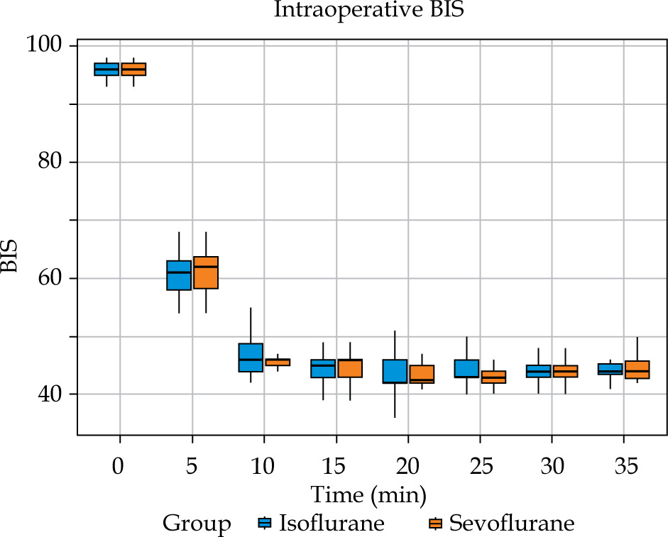 Analysis of intraoperative haemodynamics revealed no significant differences between groups in mean heart rate, systolic blood pressure, or diastolic blood pressure (Figure 3). The depth of anaesthesia was consistently maintained within target BIS limits, with nearly identical proportions of recorded time in the BIS range of 40-60 (85.9% in both groups) (Table 3). Intraoperative BIS values remained equivalent at all time points (Figure 4). During emergence, BIS recovery and MAC reduction did not differ between agents (Figure 5). The incidence of adverse events was low across both groups. Postoperative nausea and vomiting (PONV) occurred in 1 patient (2%) in the isoflurane group vs. three patients (6%) in the sevoflurane group (p = 0.617) (Table 3). No instances of shivering or significant airway complications were observed.