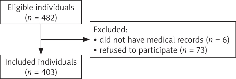 Of the 482 eligible female health workers aged 40–60 years, 79 were excluded – 6 who did not participate in the annual health screening and 73 who declined to join the study. A total of 403 participants were enrolled and completed the questionnaire (Figure 1).