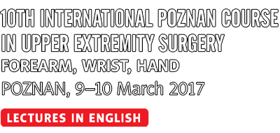 LECTURES IN ENGLISHDate: 9–10 March 2017 Venue: Congress and Teaching Centre Poznań University of Medical Sciences 37 A Przybyszewskiego St Poznan, Poland Contents partner & scientific supervision: Hand Surgery Section of Polish Society of Orthopedics and Traumatology, Department of Orthopaedics, Traumatology and Hand Surgery Poznań University of Medical Sciences Organizer: Termedia Publishing House Organisers’ office: Termedia Publishing House ul. Kleeberga 2 61-615 Poznań Phone/fax: + 48 61 656 22 00 szkolenia@termedia.pl www.termedia.pl Participants will receive credits for the course. |