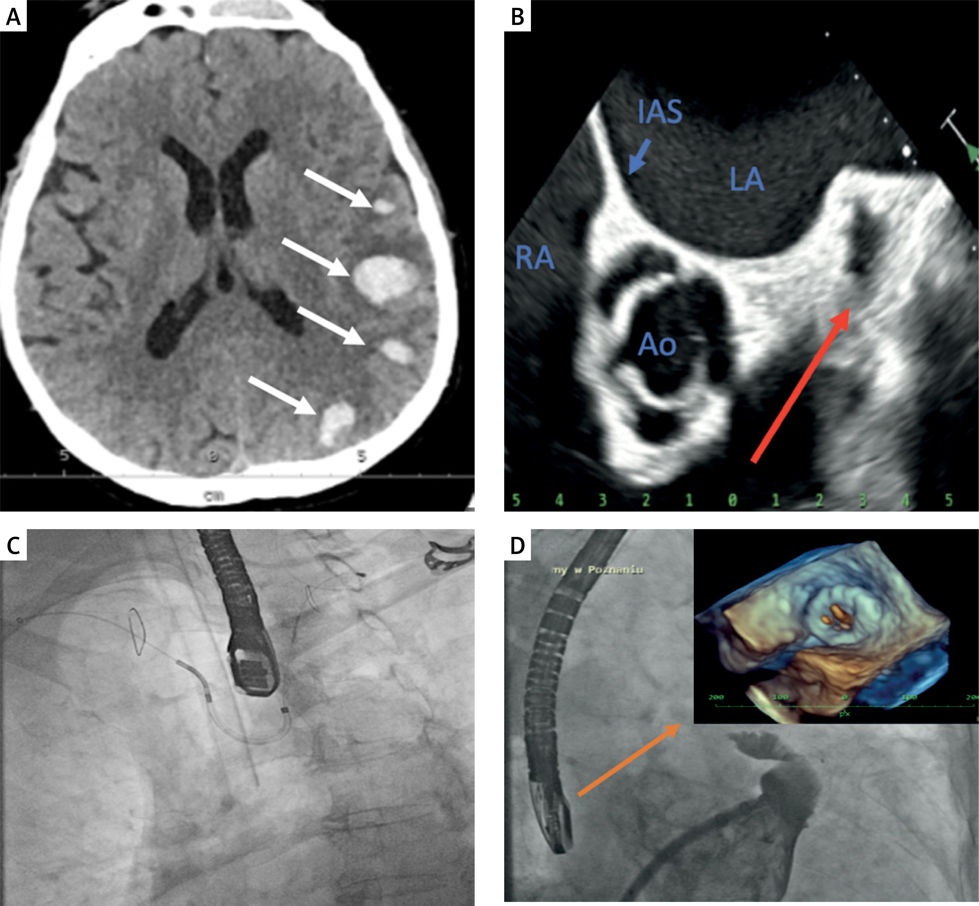 A – A non-contrast computed tomography scan showing multiple hemorrhages in the left hemisphere (white arrows). B – Transesophageal echocardiography image depicting thrombus presence in the left atrial appendage (red arrow). C – Introduction of a Sentinel System in the brachiocephalic artery and left common carotid artery for cerebral protection. D – Angiographic and echocardiographic (orange arrow) views showing acceptable device position without leak