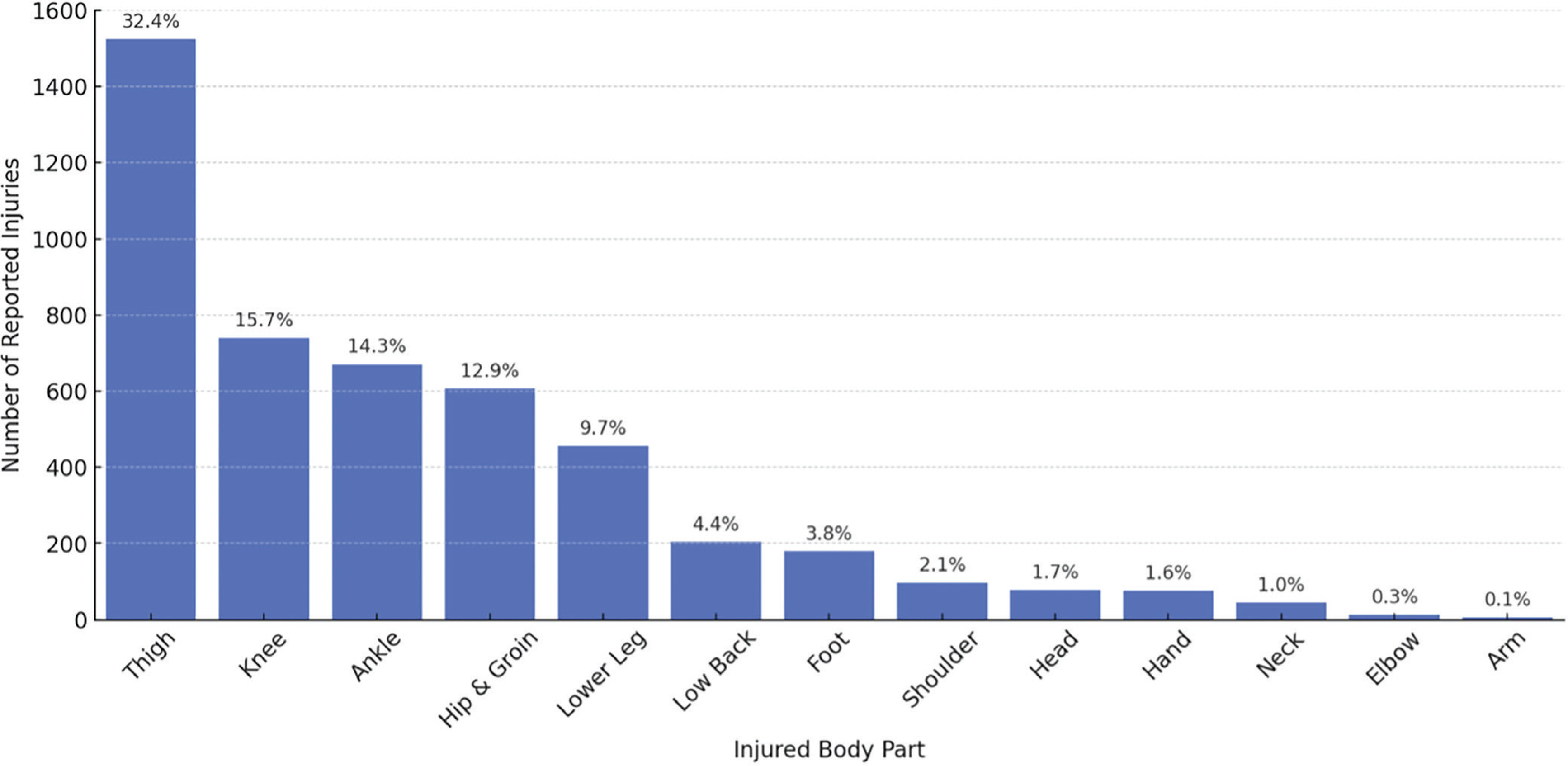 Over the nine seasons studied, there were a total of 4,700 injuries recorded for 1,250 players. Injuries by body parts are presented in Figure 1, which shows the distribution of the most commonly injured body parts: thigh (32.4%), knee (15.7%), ankle (14.3%), hip and groin (12.9%), and lower leg (9.7%).